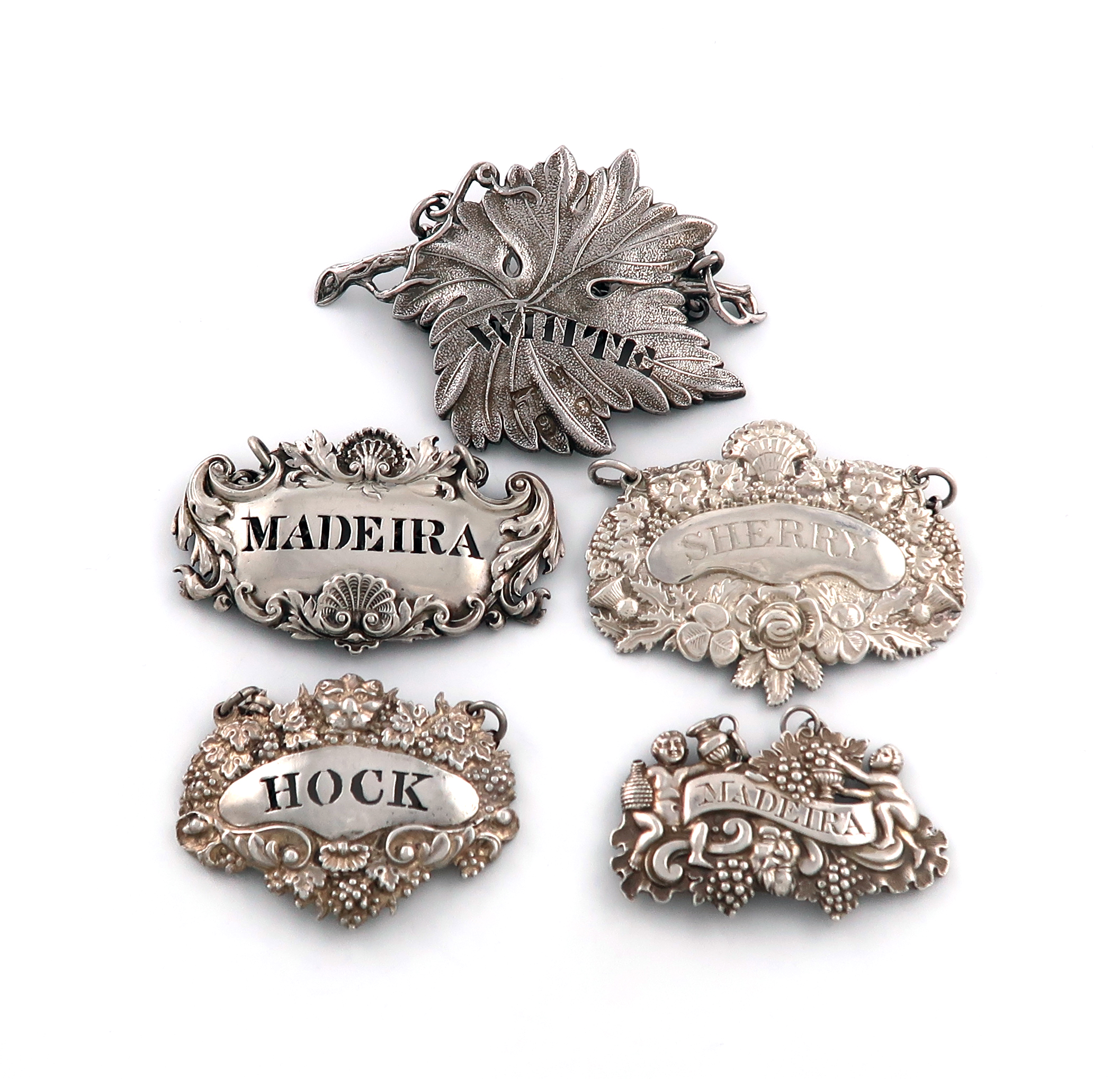comprising: one pierced 'HOCK', with foliate and shell decoration, by Charles Rawlings & Williams Summers, London, one incised 'SHERRY' with foliate and shell decoration, maker's mark IG, London 1819, one incised 'MADEIRA', shaped form, two Bacchanalian cherubs and foliate decoration, by Matthew Linwood, Birmingham 1813, one pierced 'WHITE', modelled form of a leaf, by Robin Gainsford, Sheffield 1827, one pierced 'MADEIRA', shaped form with foliate and shell decoration, by Charles Reily & George Storer, London 1840, approx. weight 2.3 oz. (5)