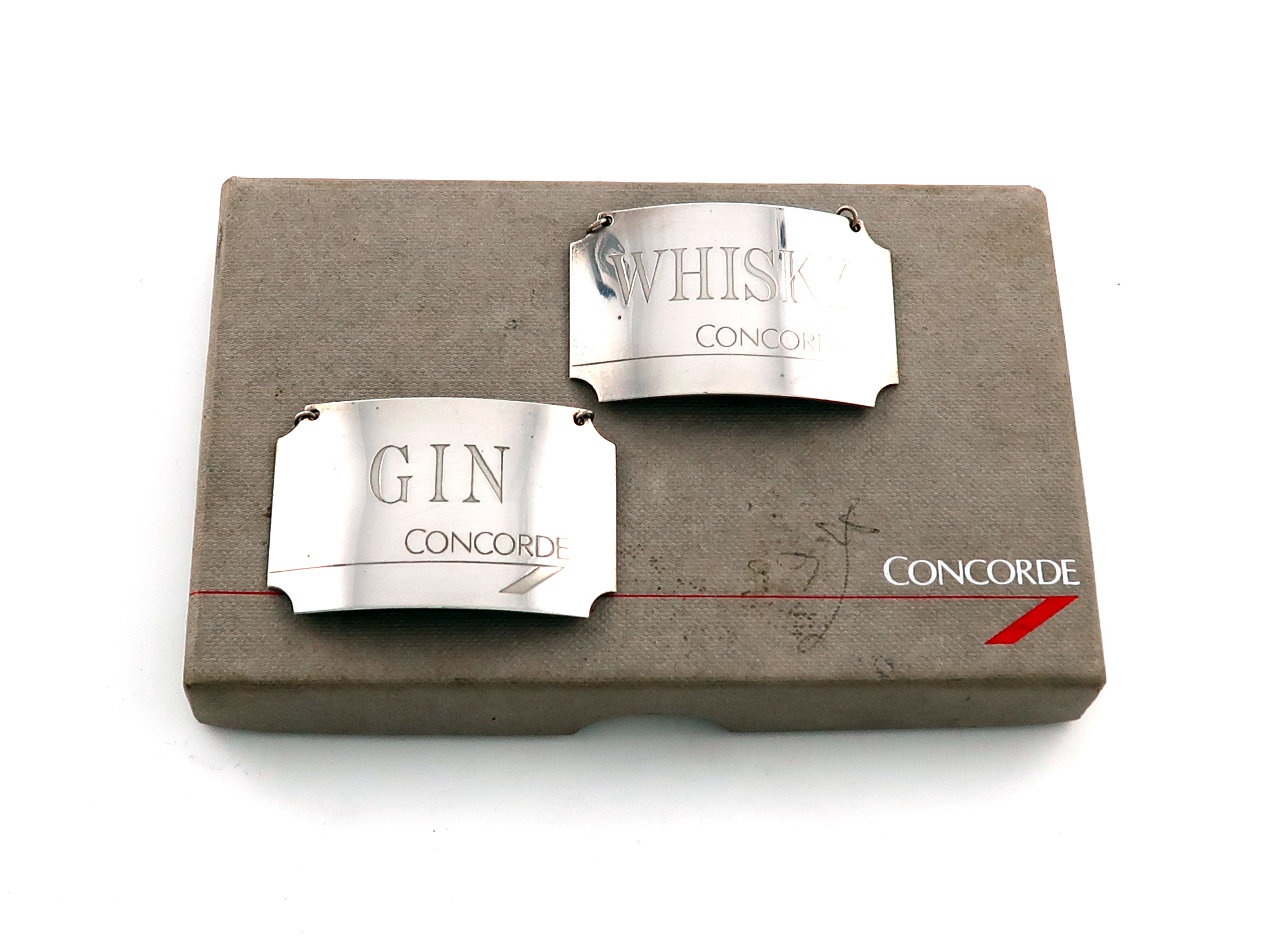 of rectangular form, canted corners, incised 'GIN CONCORDE' and 'WHISKY CONCORDE', length 5cm, total approx. weight 0.9oz. (2)