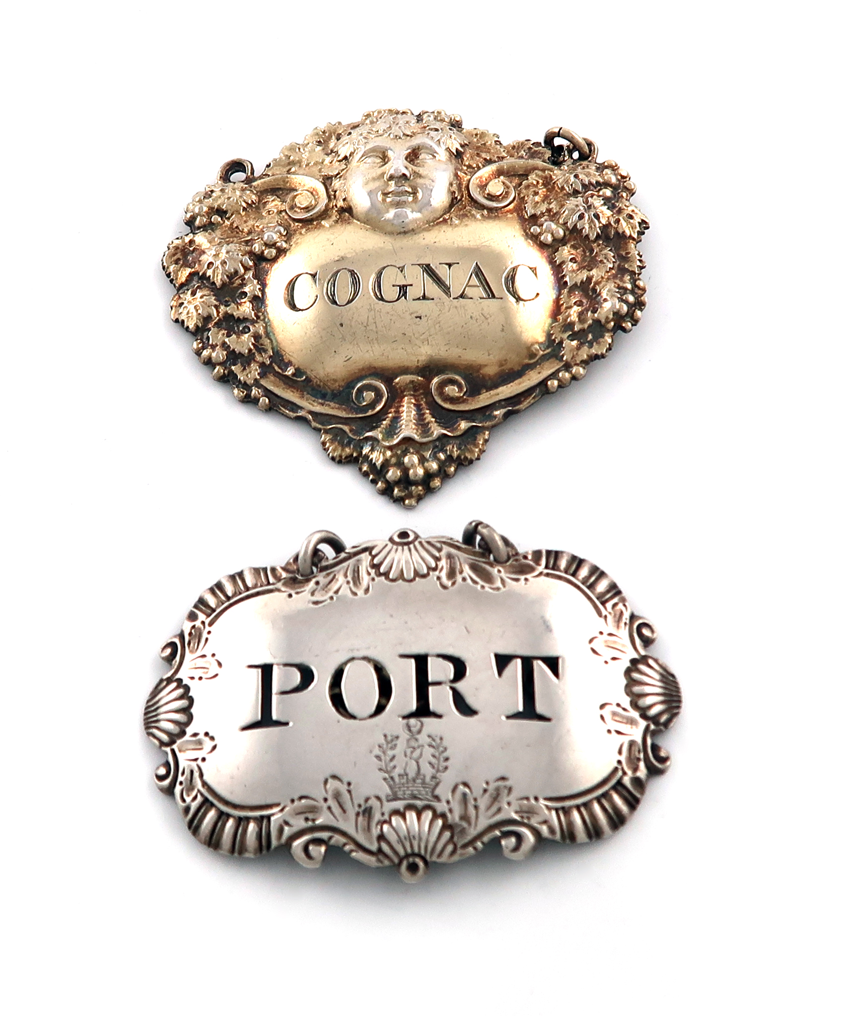 of shaped rectangular form, gadrooned and shell border with an engraved crest, pierced 'PORT', length 5.6cm, and a silver-gilt Victorian label by Charles Rawlings & William Summers, London 1862, shaped rectangular form, a face covered by foliate and scroll decoration, incised 'COGNAC', length 5.7cm, total approx. weight 1.4oz. (2)