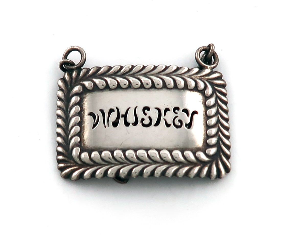 of rectangular form, fluted gadrooned border, pierced 'WHISKEY', length 3.5cm, approx. weight 0.3oz.