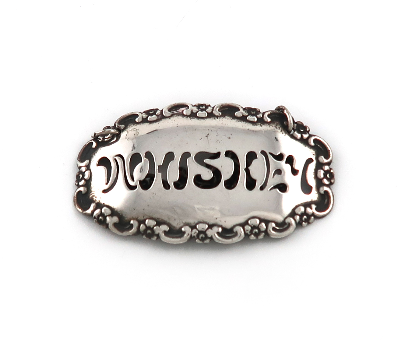 shaped oblong form, foliate scroll border, pierced 'WHISKEY', length 4.8cm, approx. weight 0.3oz.