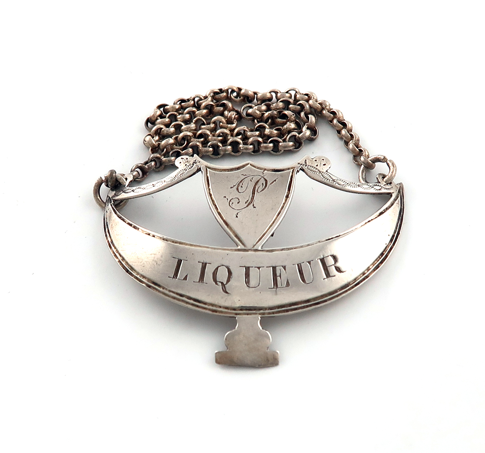 crescent and shield form, reeded and bright cut border, engraved initial and later incised 'LIQUEUR', length 5cm, approx. weight 0.2oz.