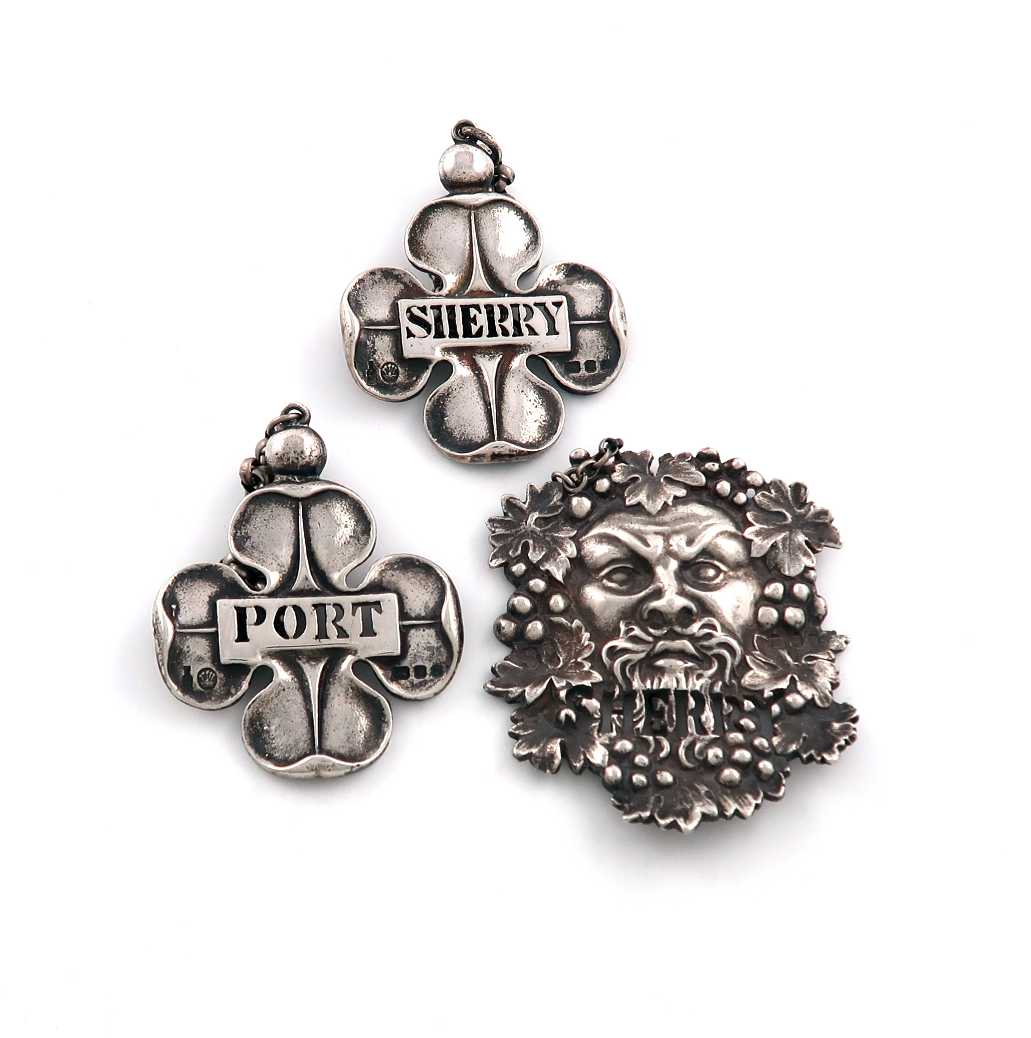two modelled as a four leaf clover, pierced 'SHERRY' and 'PORT', length 5cm, plus one modelled as a Bacchanalian mask, pierced 'SHERRY', height 6.6cm, total approx. weight 4.8oz. (3)