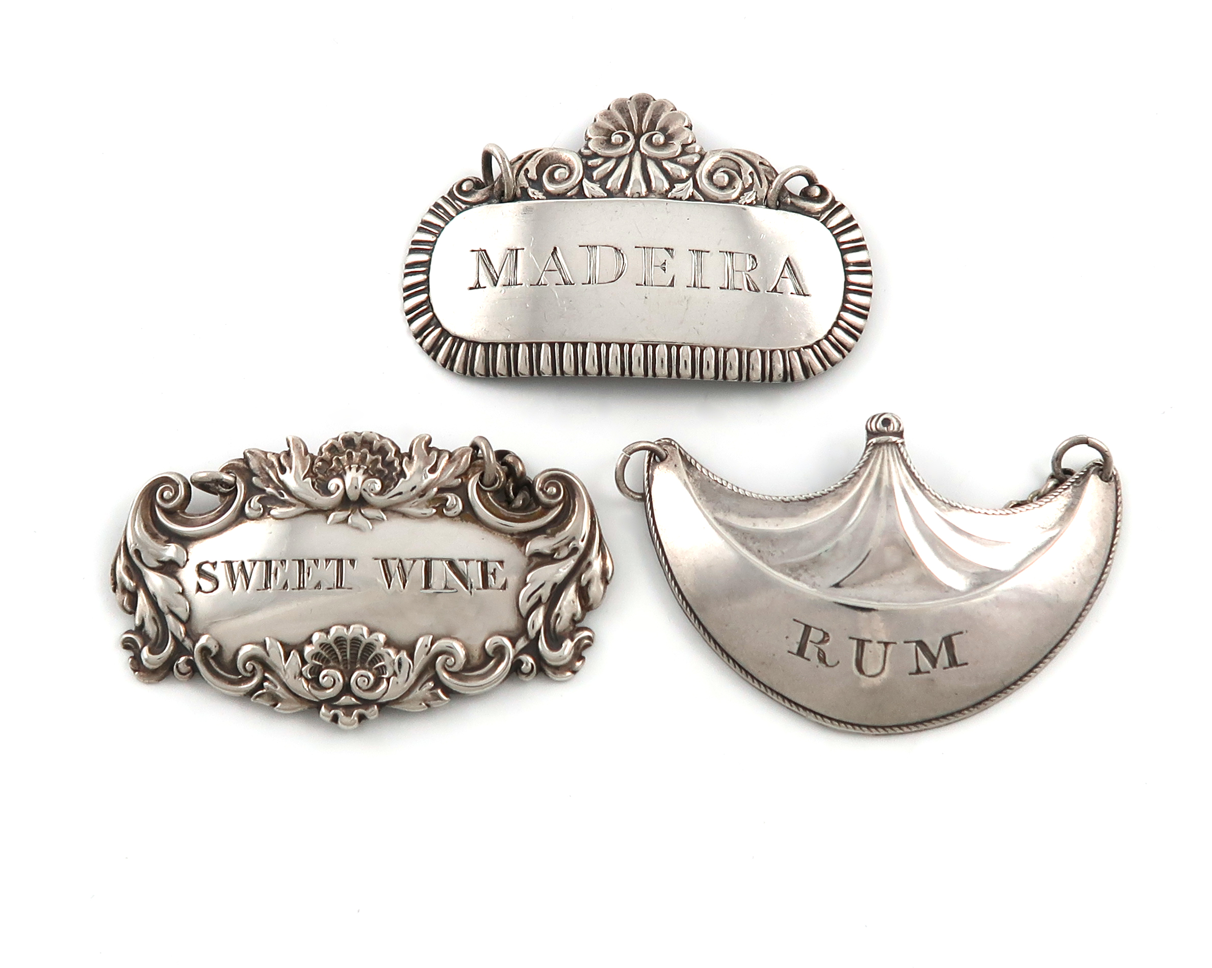 comprising: one of scroll and drape form, by Luke, Proctor and Co., Sheffield 1790, incised 'RUM', plus one by Walker Knowles & Co., Sheffield 1841, incised 'SWEET WINE' and one by Matthew Linwood, Birmingham 1819, incised 'MADEIRA', approx. weight 1oz. (3)