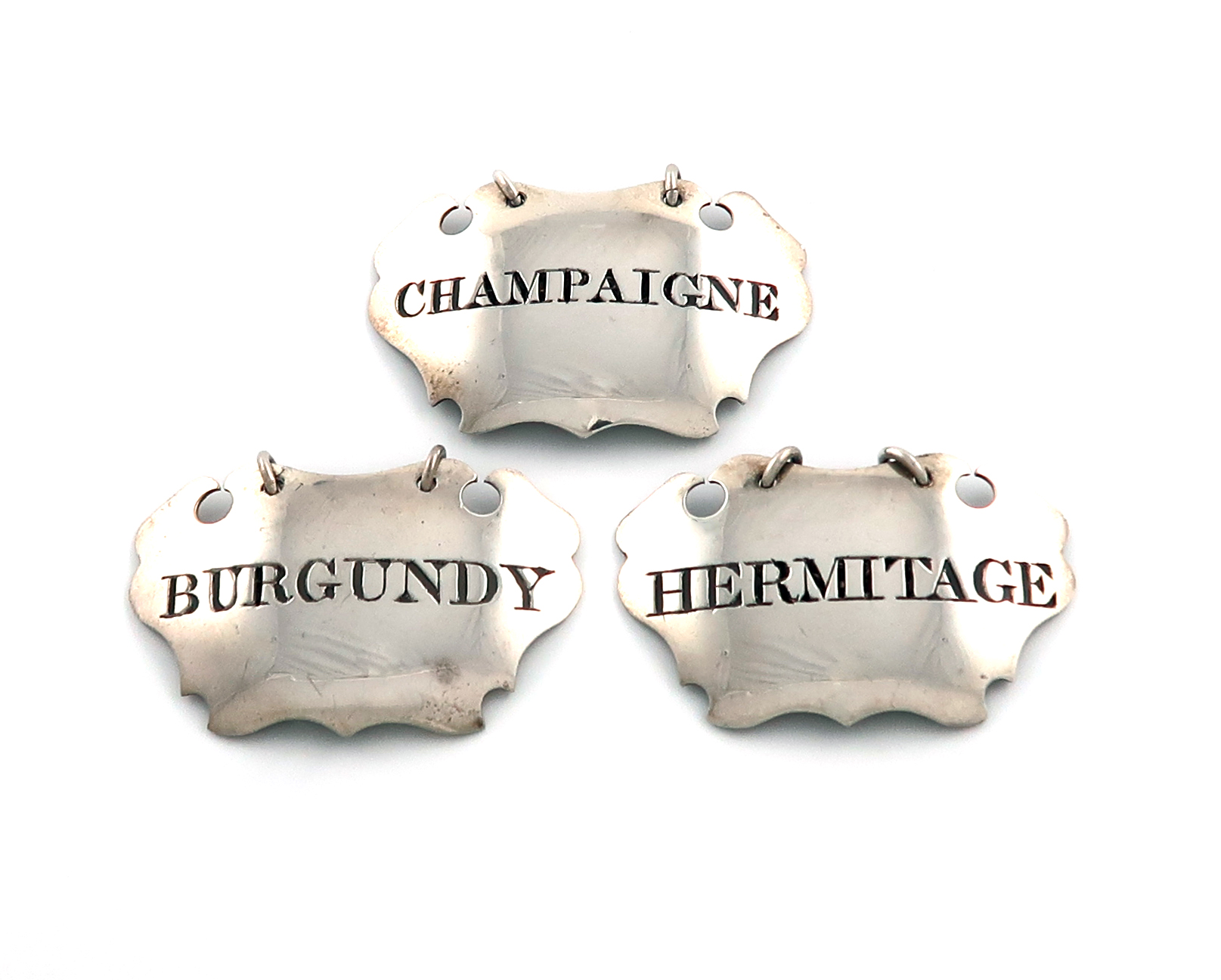 of shaped escutcheon form, one pierced 'CHAMPAIGNE', length 5.5cm, one pierced 'HERMITAGE', length 5.4cm and one pierced 'BURGUNDY', length 5.3cm, total approx. weight 1.3oz. (3)