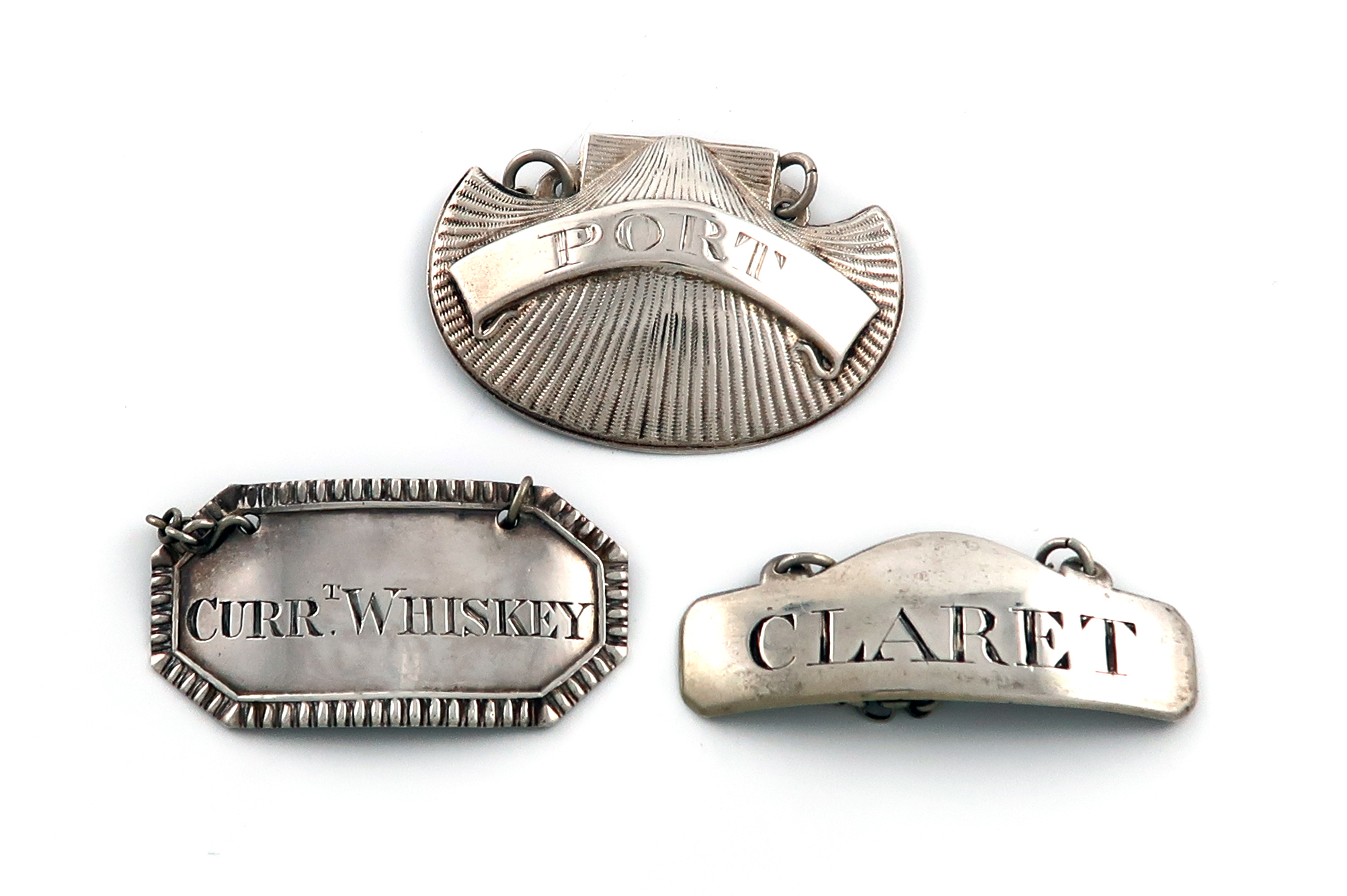 comprising: one by John Teare, Dublin circa 1818, shell form, incised 'PORT', length 5.1cm, one by John Townsend, Dublin 1813, rectangular form, with canted corners and gadrooned border, incised 'CURR. T WHISKEY', length 4.9cm, one by marked IE and William Law, Dublin 1814, shaped rectangular form, incised 'CLARET' length 5.2cm, total approx. weight 0.8oz. (3)