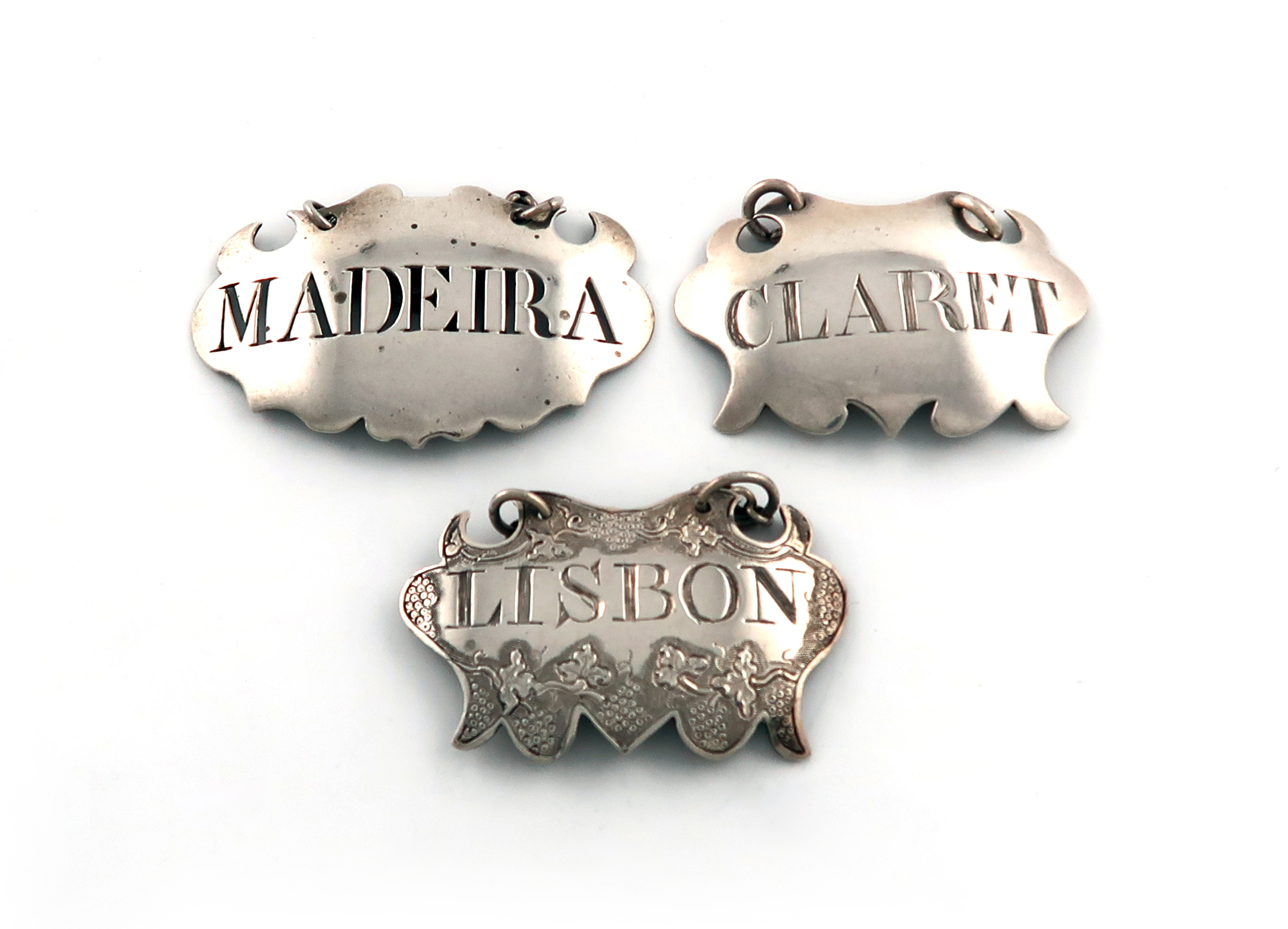 comprising: one probably by John Rich, London circa 1765, shaped escutcheon form, pierced 'MADEIRA', length 5.4cm, one by James Wilks, London circa 1740, shaped escutcheon form, with vine and grape decoration, incised 'LISBON', length 4.8cm, and one marked IS script, shaped escutcheon from, incised 'CLARET', length 4.8cm, total approx. weight 1.1oz. (3)