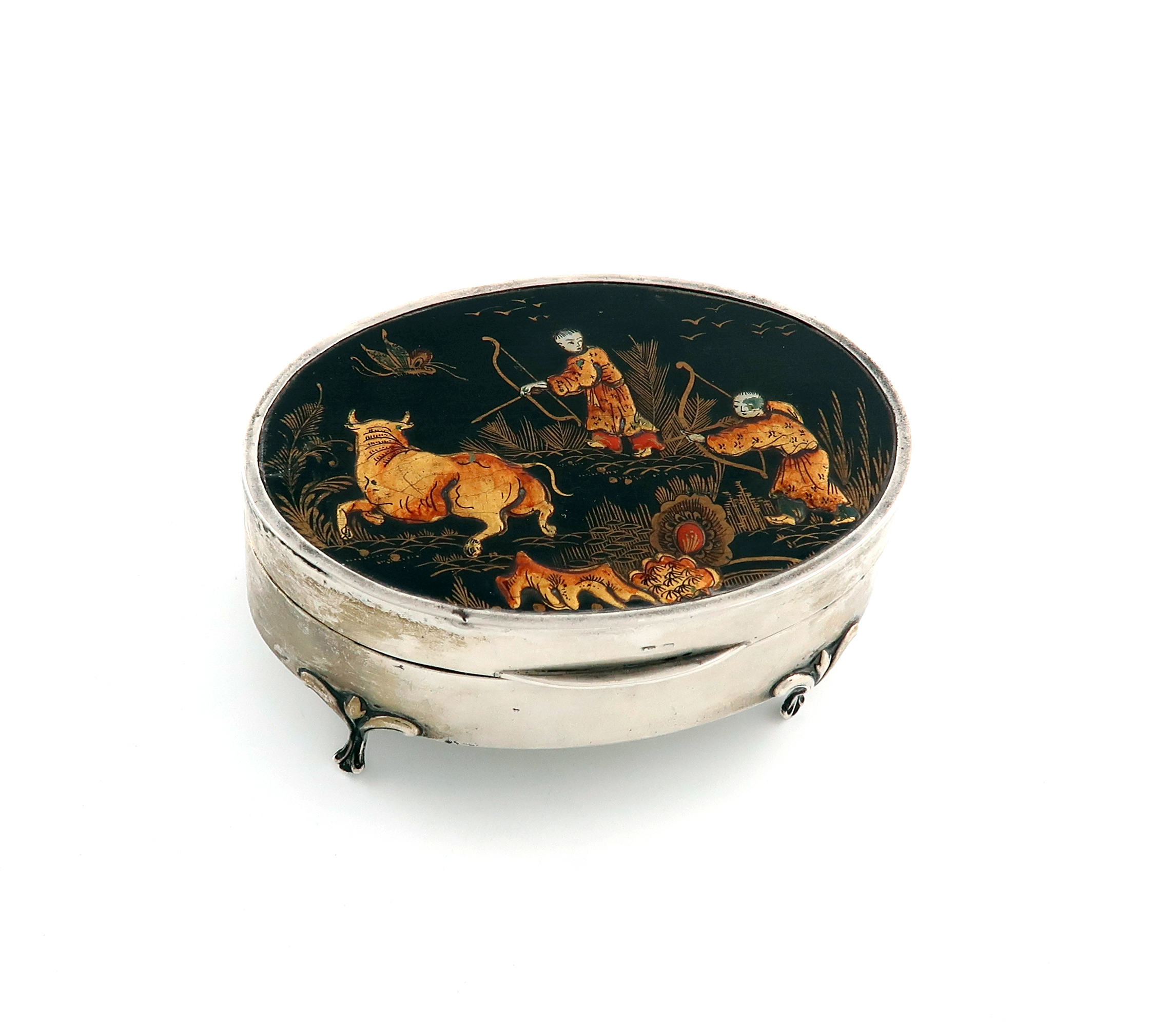 of oblong form, the cover with a black and gilt lacquer hunting scene, hinged cover with a plain thumb piece, velvet lined, on four scroll feet, length 13.2cm.