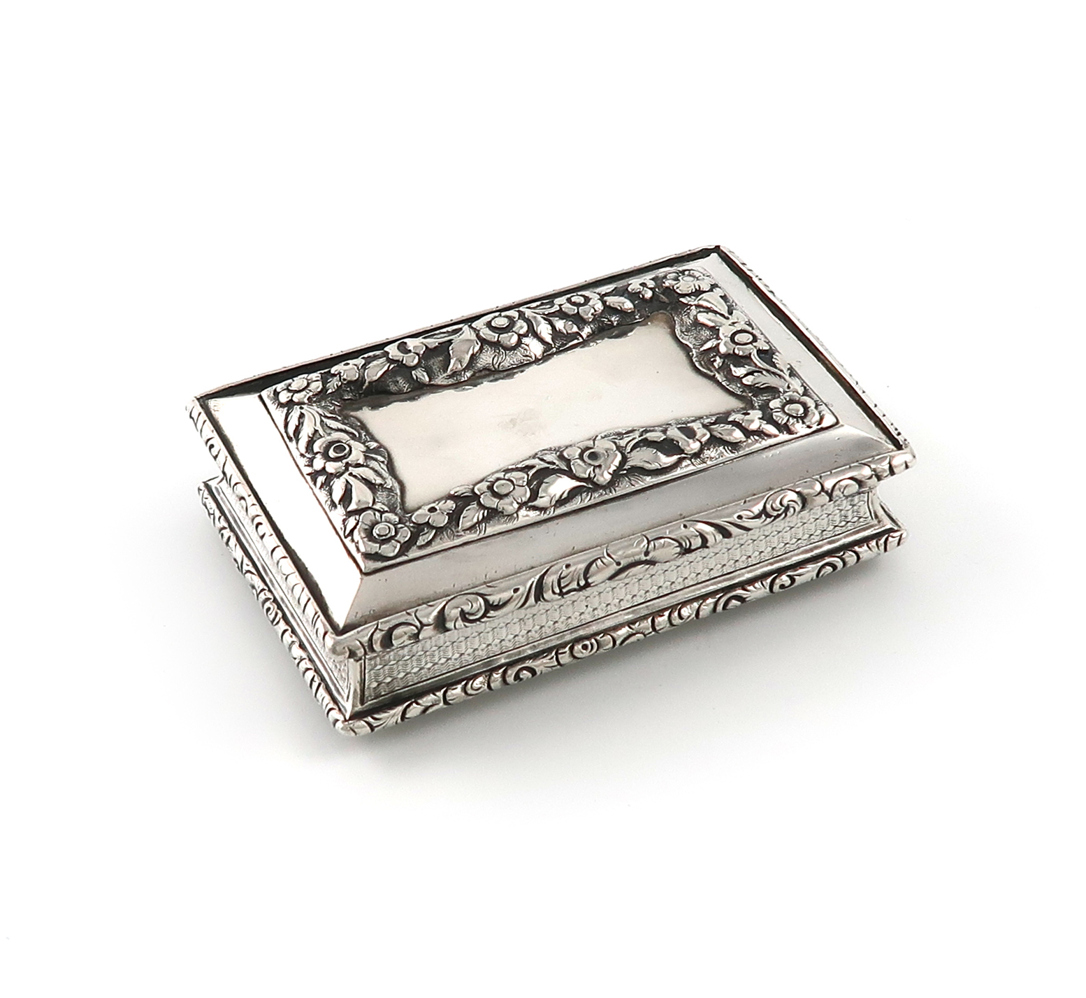 rectangular form, engine-turned sides an base, the hinged cover with a foliate border, length 8.6cm, approx. weight 5.2oz.