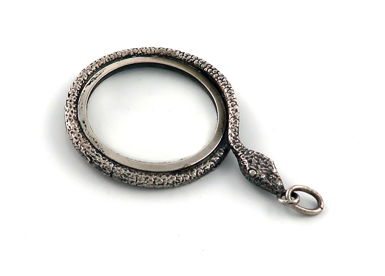 circular form, the border and handle modelled as a coiled snake, with a ring attachment, length 7.3cm.