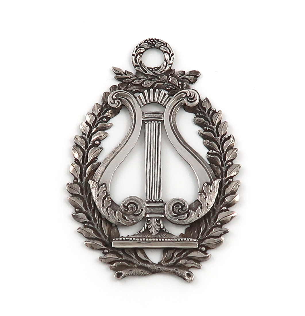 shaped oval form, foliate borders with a centre lyre motif, length 9cm, approx. weight 1.7oz.