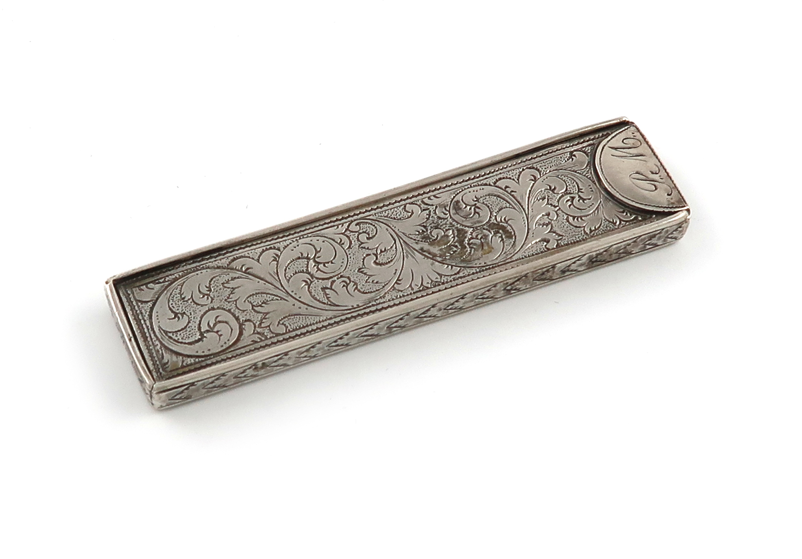 rectangular form, the sides with chevron decoration, the cover and base with foliate scroll decoration, the slide-off cover with initials, length 8.2cm, approx. weight 1.1oz.