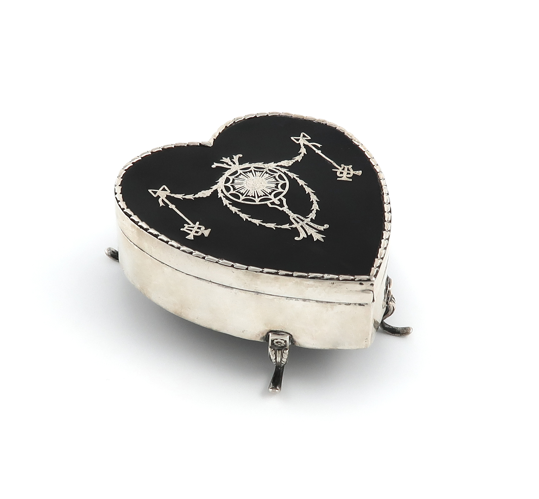 heart form, with a hinged tortoiseshell cover with silver inlay and garland border, velvet lined, on four foliate scroll feet, length 11.9cm.