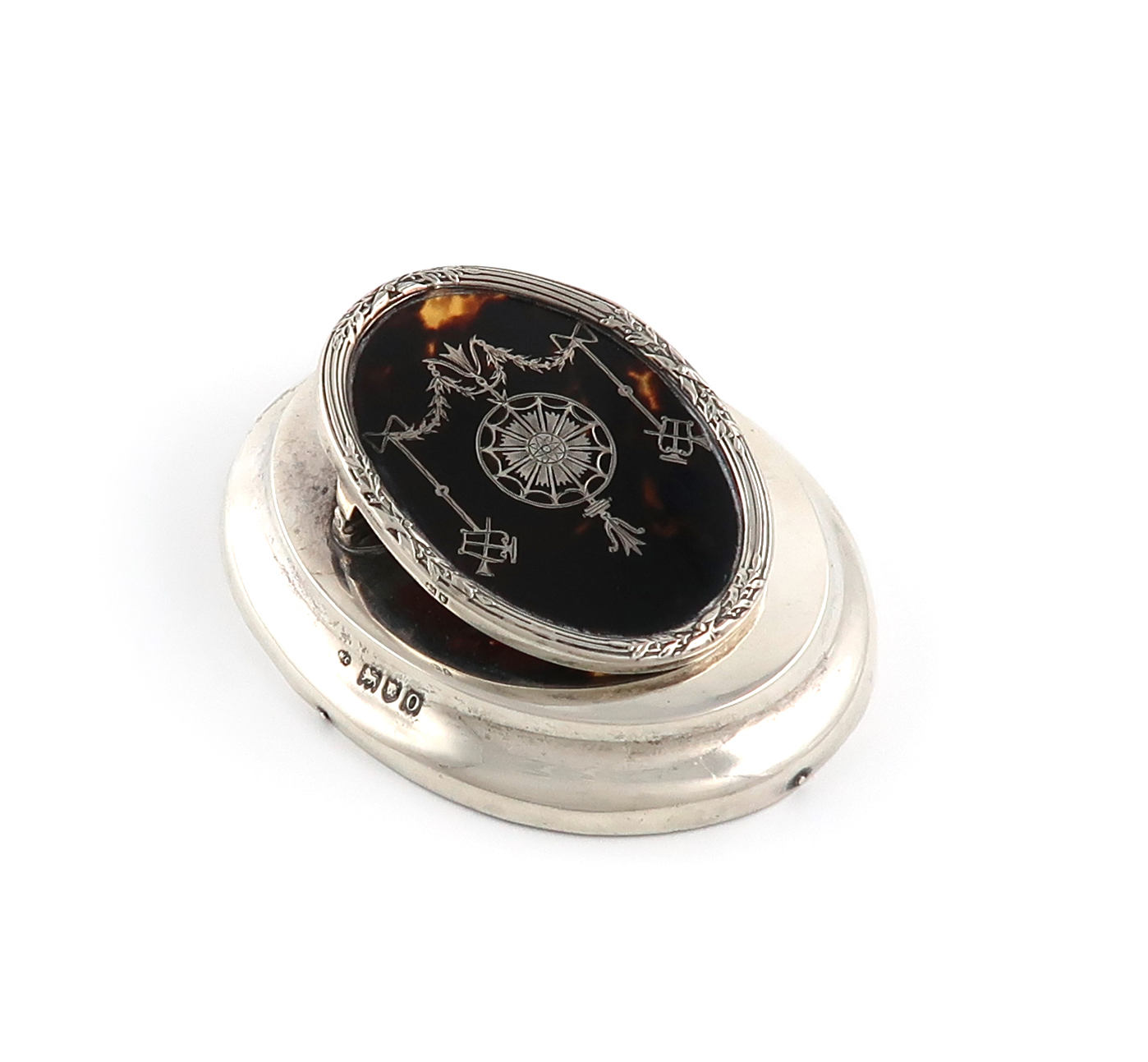 oval form, with a tortoiseshell clip with silver inlay and foliate and reed border, on a raised oval foot, length 10.1cm,