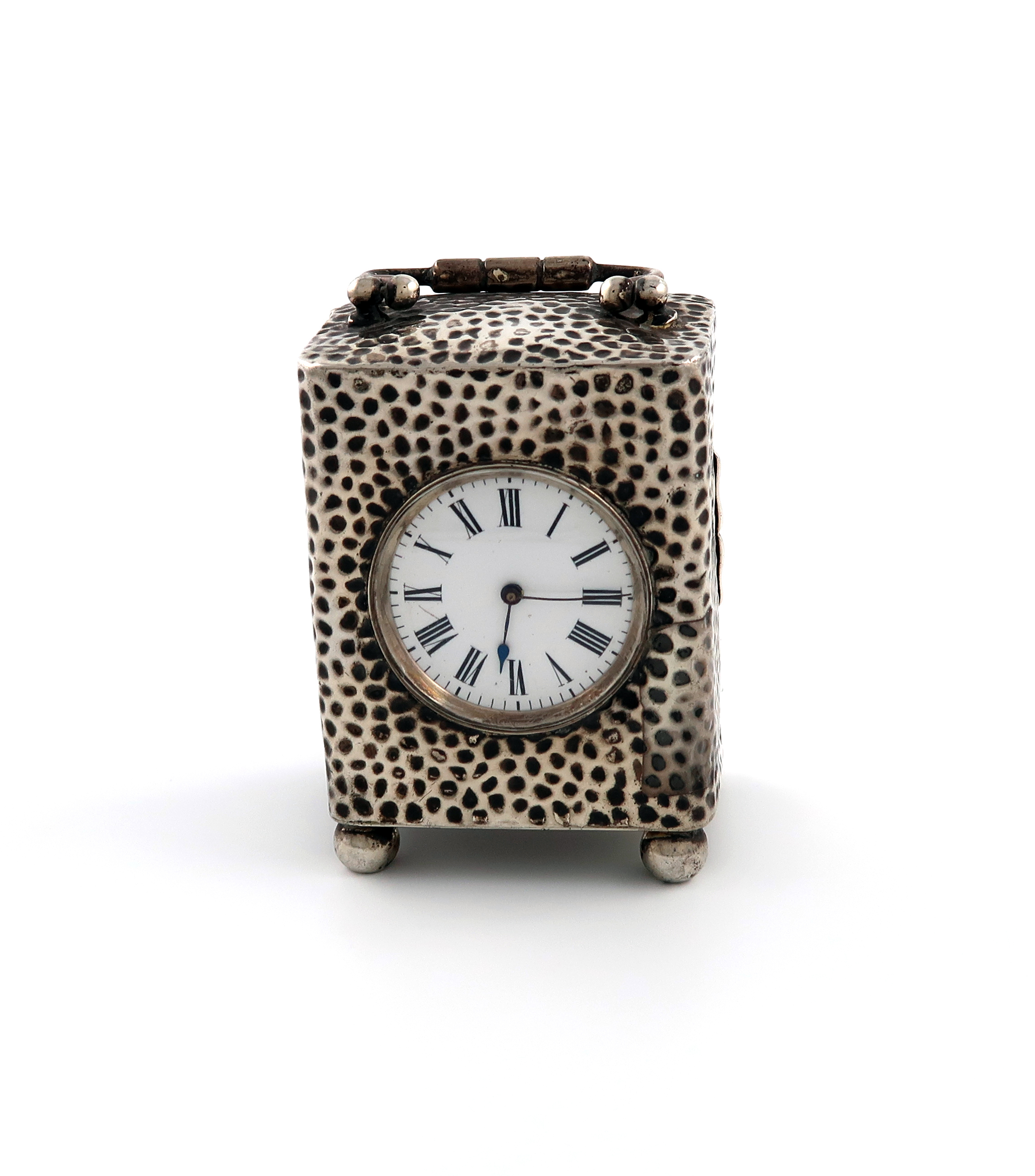 upright rectangular form, spot-hammered decoration, hinged scroll carrying handle, enamelled dial, on four bun feet, height 6.7cm.