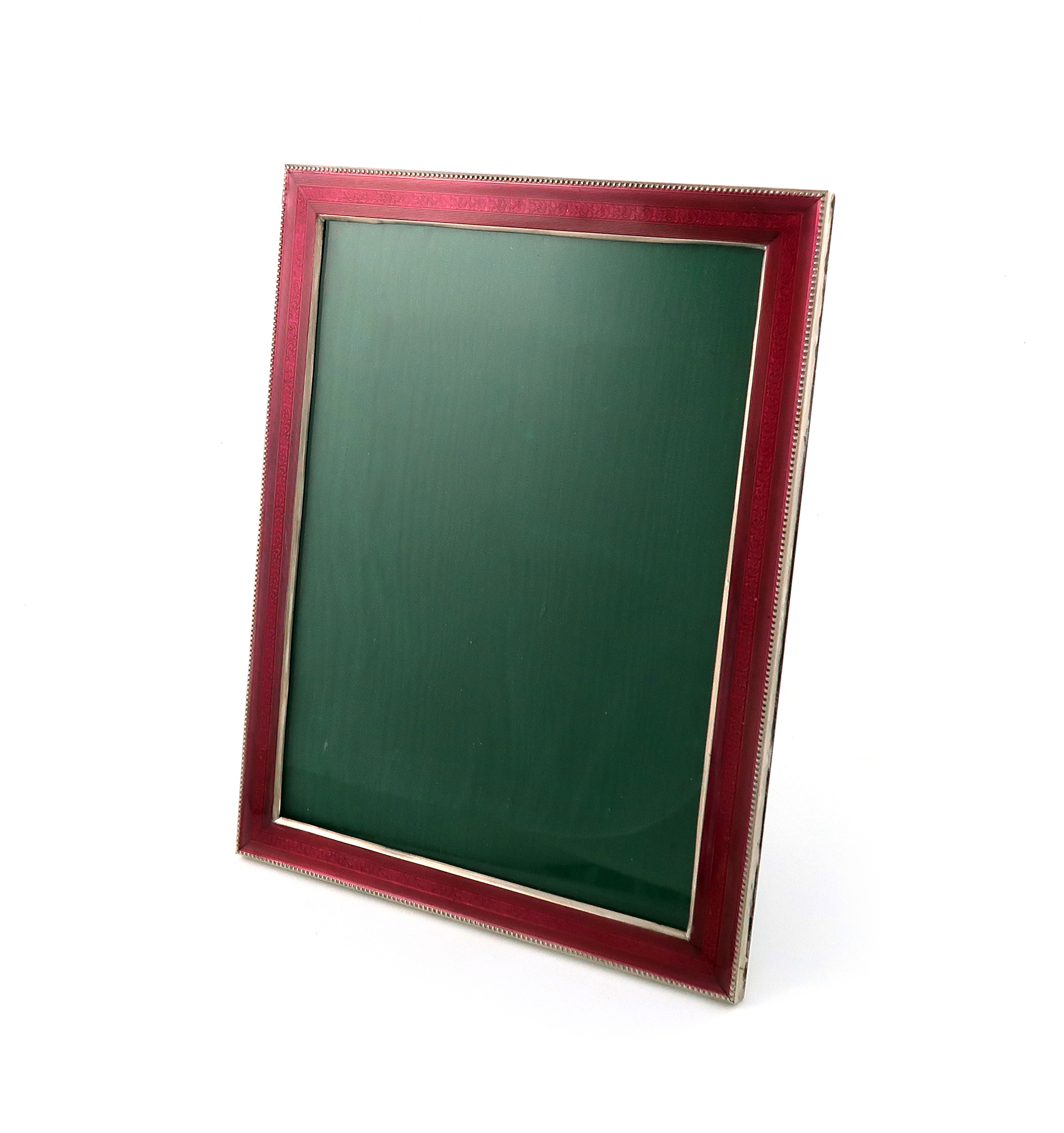 upright rectangular form, dark pink enamel decoration, beaded border, wooden easel back, height 27.3cm.