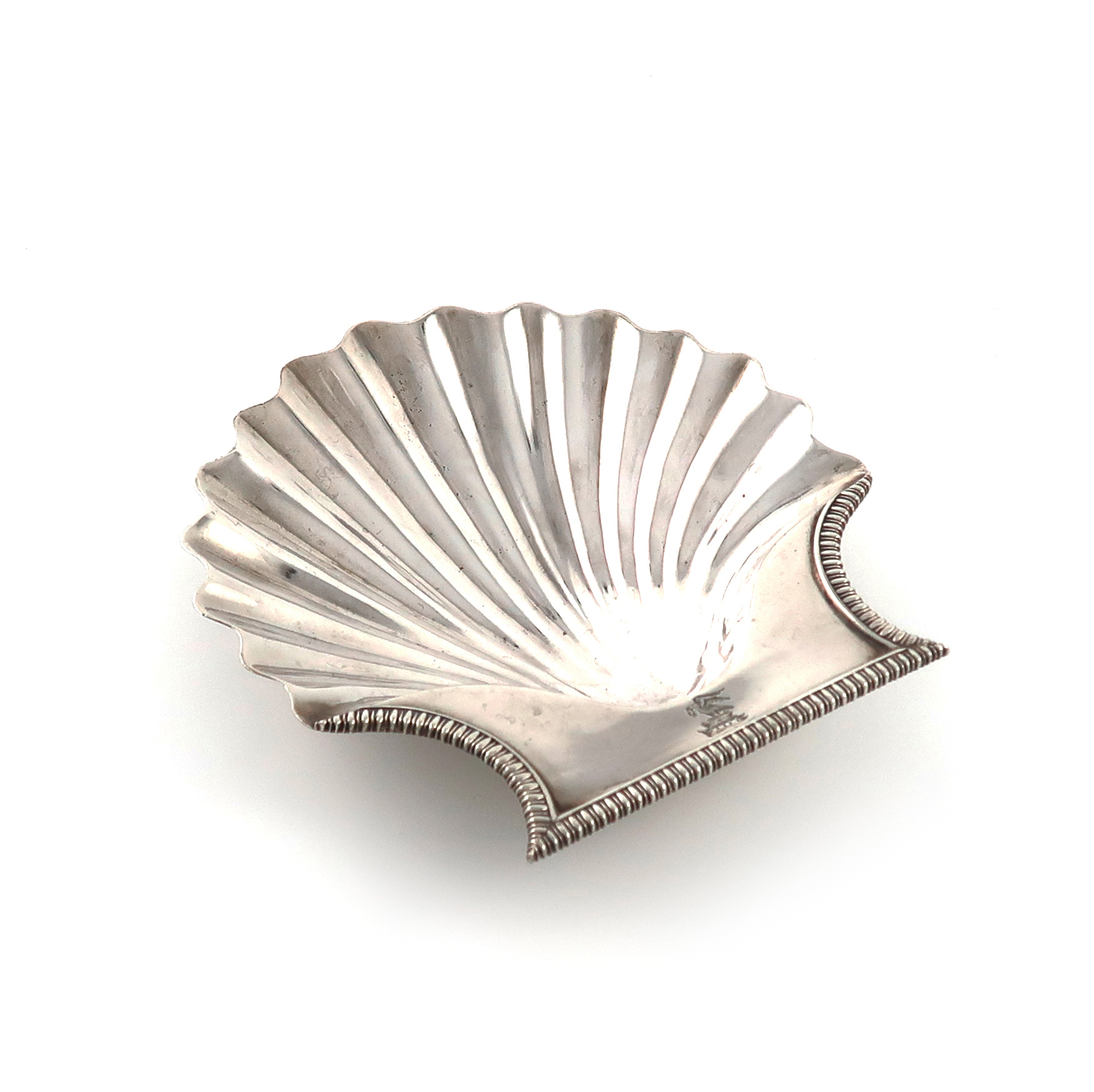 shell form, gadroon border, engraved with a crest, on four shell feet, length 13.5cm, approx. weight 4.5oz.