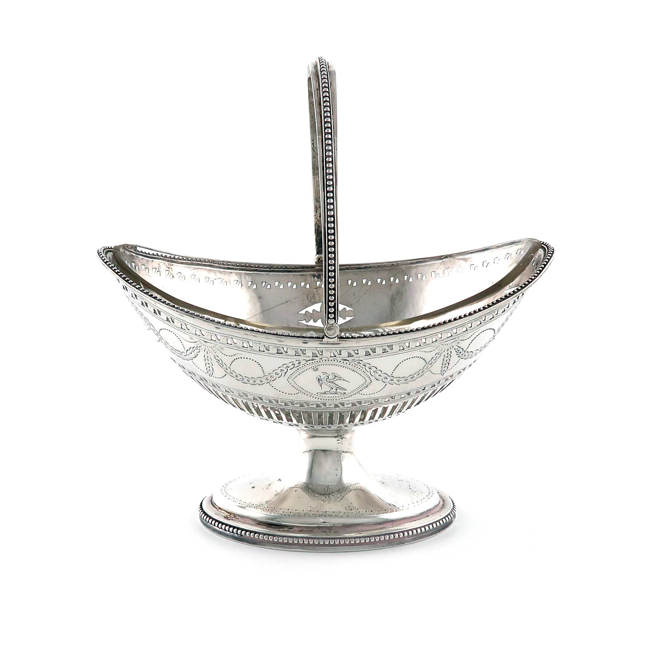 oval form, pierced with slats and with engraved decoration, beaded borders and swing-handle, engraved with a crest, with a later clear glass liner, on a raised oval foot, length 17.8cm, approx. weight 7.3oz.