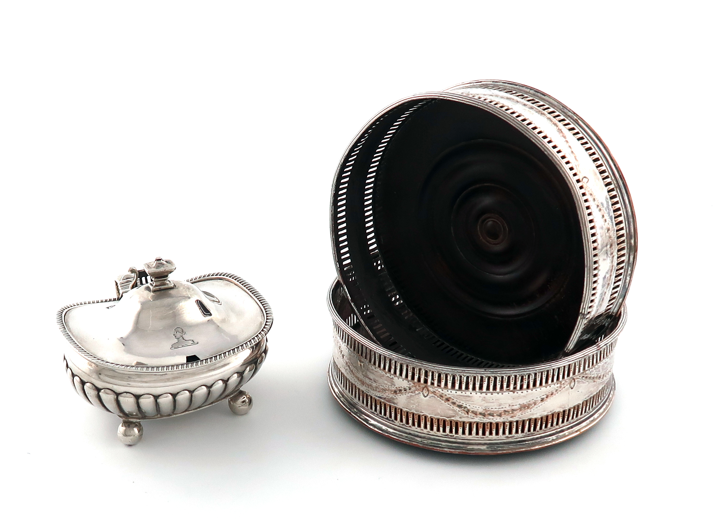 rounded rectangular form, part-fluted decoration, gadroon border rim, engraved armorial, raised hinged top, lyre thumb-piece, on four bun feet, with a later clear glass liner, plus a pair of old Sheffield plated wine coasters, with pierced slats, turned wooden bases, approx. weighable 5.19oz. (3)