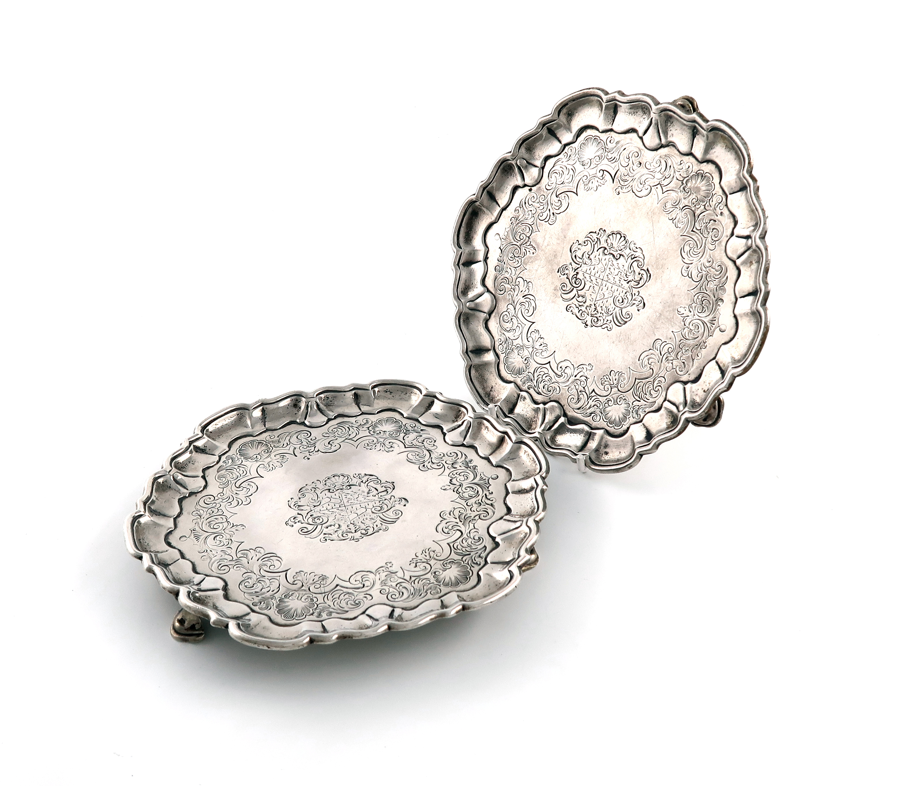 circular form, shaped border, the centre with chased foliate and shell decoration and an armorial within foliate mantling, on three pad feet, diameter 18.2cm, approx. weight 20oz. (2)