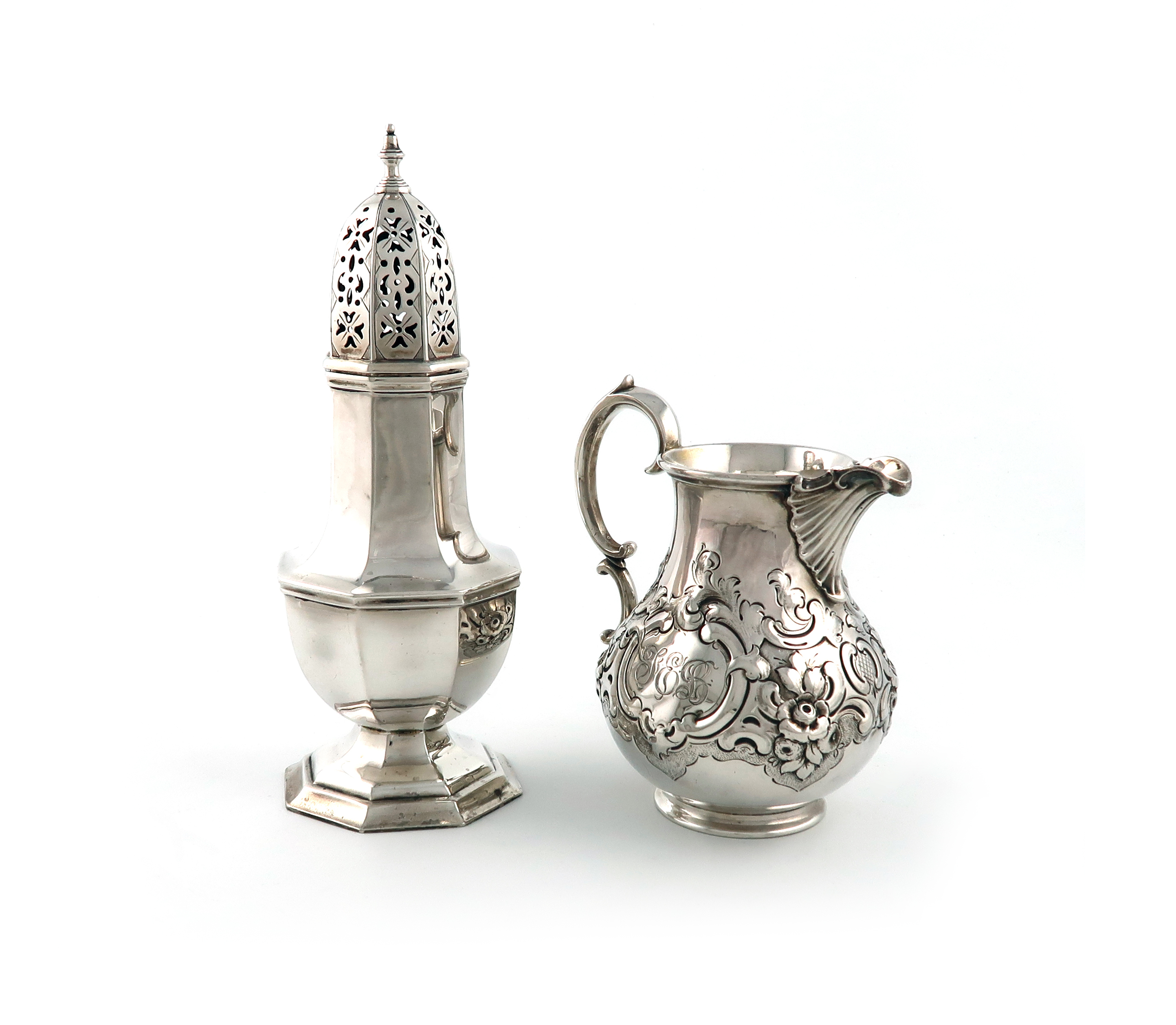 baluster form, embossed foliate scroll decoration, on a circular foot, height 13cm, plus an Edwardian silver sugar caster, by The Goldsmiths and Silversmiths Company, London 1901, octagonal baluster form, approx. total weight 14.5oz. (2)