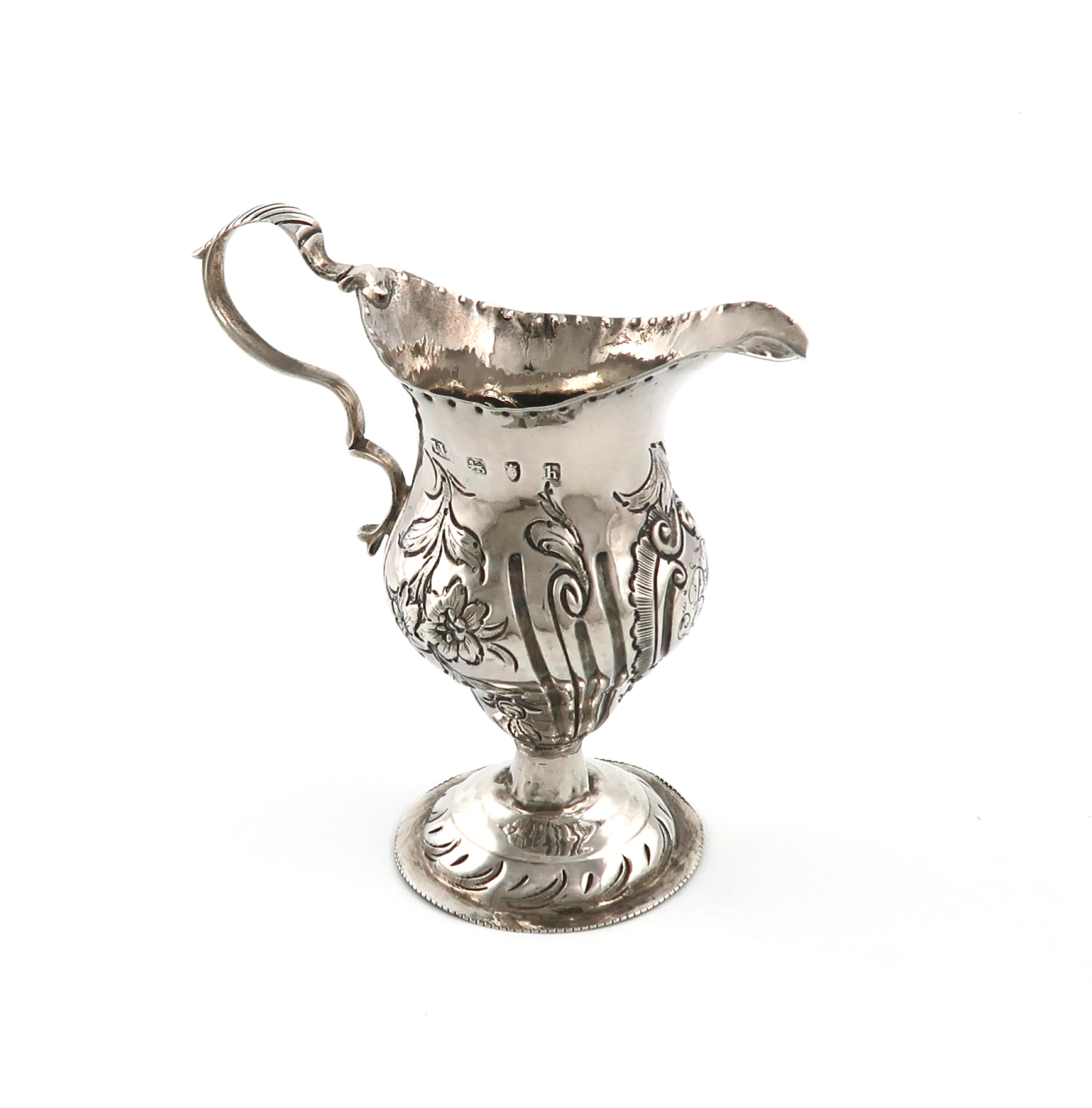 baluster form, embossed foliate and part fluted decoration, engraved initials within a central foliate cartouche, scroll handle, on a raised circular foot, height 11.7cm, total approx. weight 2.4oz.