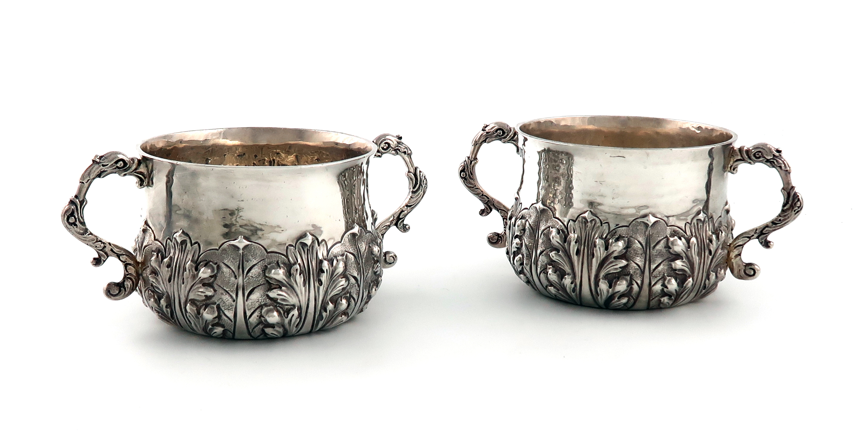 circular form, embossed acanthus leaf decoration, mythical dolphin head scroll handles, height 6.7cm, approx. weight 14oz. (2)
