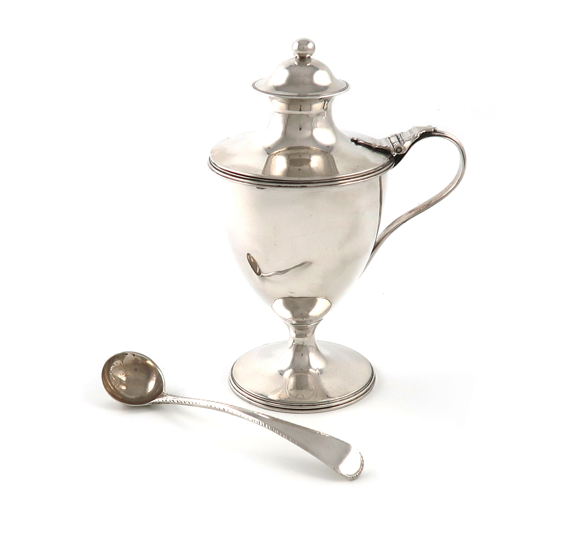 urn shaped bowl with a hinged baluster cover, reeded scroll handle, reeded borders, on a raised circular foot, with a later blue glass liner, height 13.4cm, plus a George III condiment ladle with over stamped makers mark, London 1790, with feather edge decoration, total approx. weight 5oz. (2)
