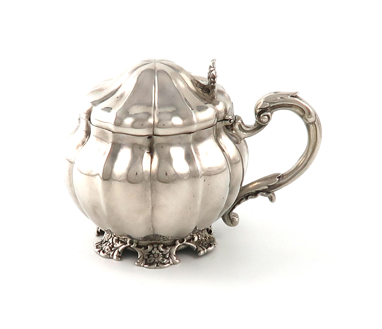 lobed circular bellied form, a domed hinged cover with a foliate thumb piece, with foliate and scroll formed handle, on scroll foliate decorated feet, with a blue glass liner, height 7.8cm, approx. weight 7oz.