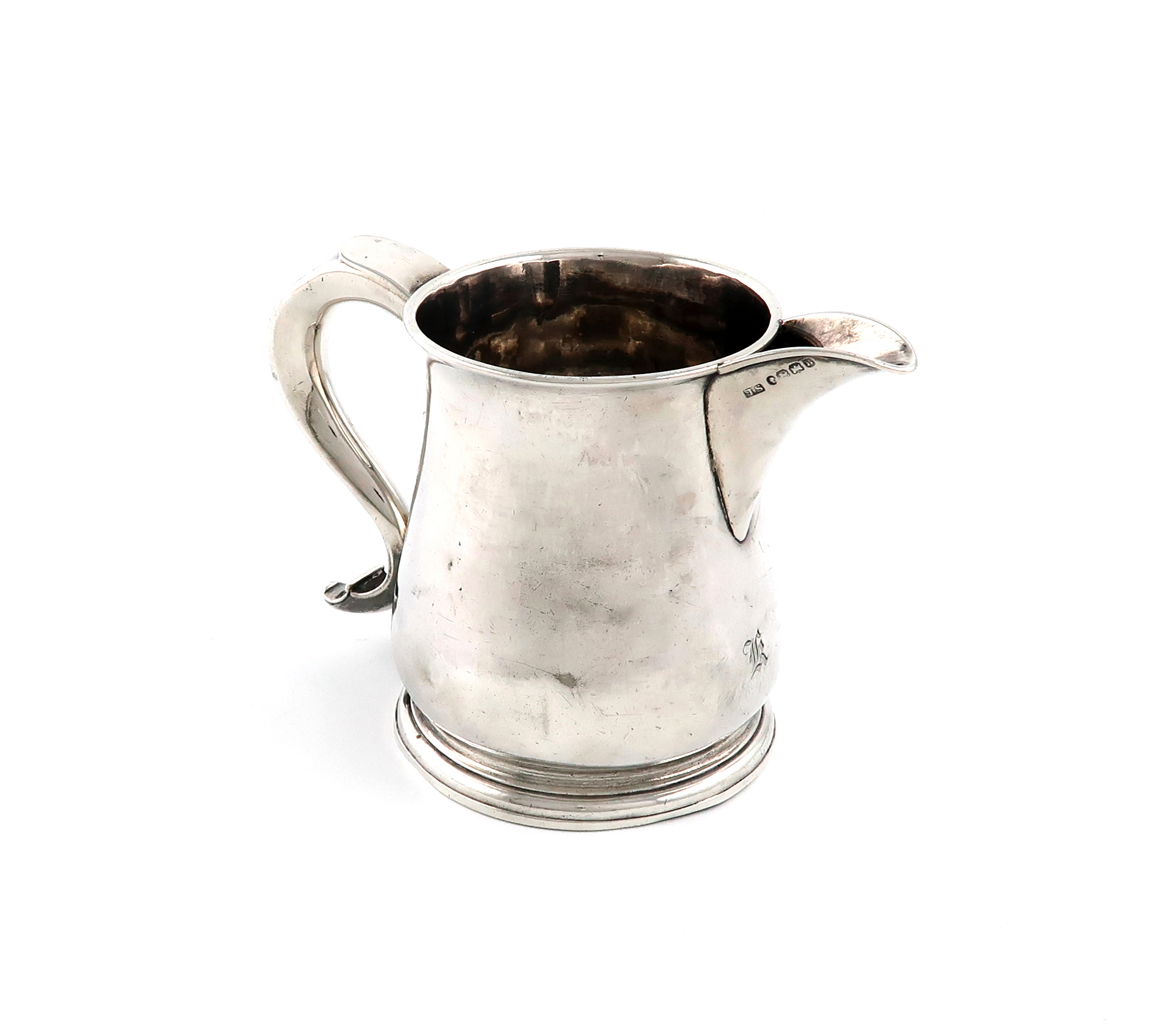 tapering circular form, scroll handle, plain spout, on a circular foot, height 11cm, approx. weight 9.4oz.