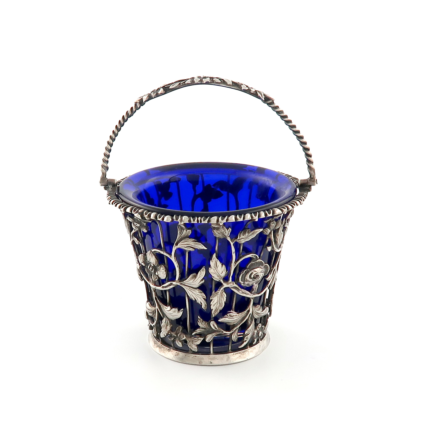 tapering circular form, the body with foliate wire-work decoration, gadroon border with pierced swing-handle, and a blue glass liner, height 11.3 cm, approx. weight 2.6oz.
