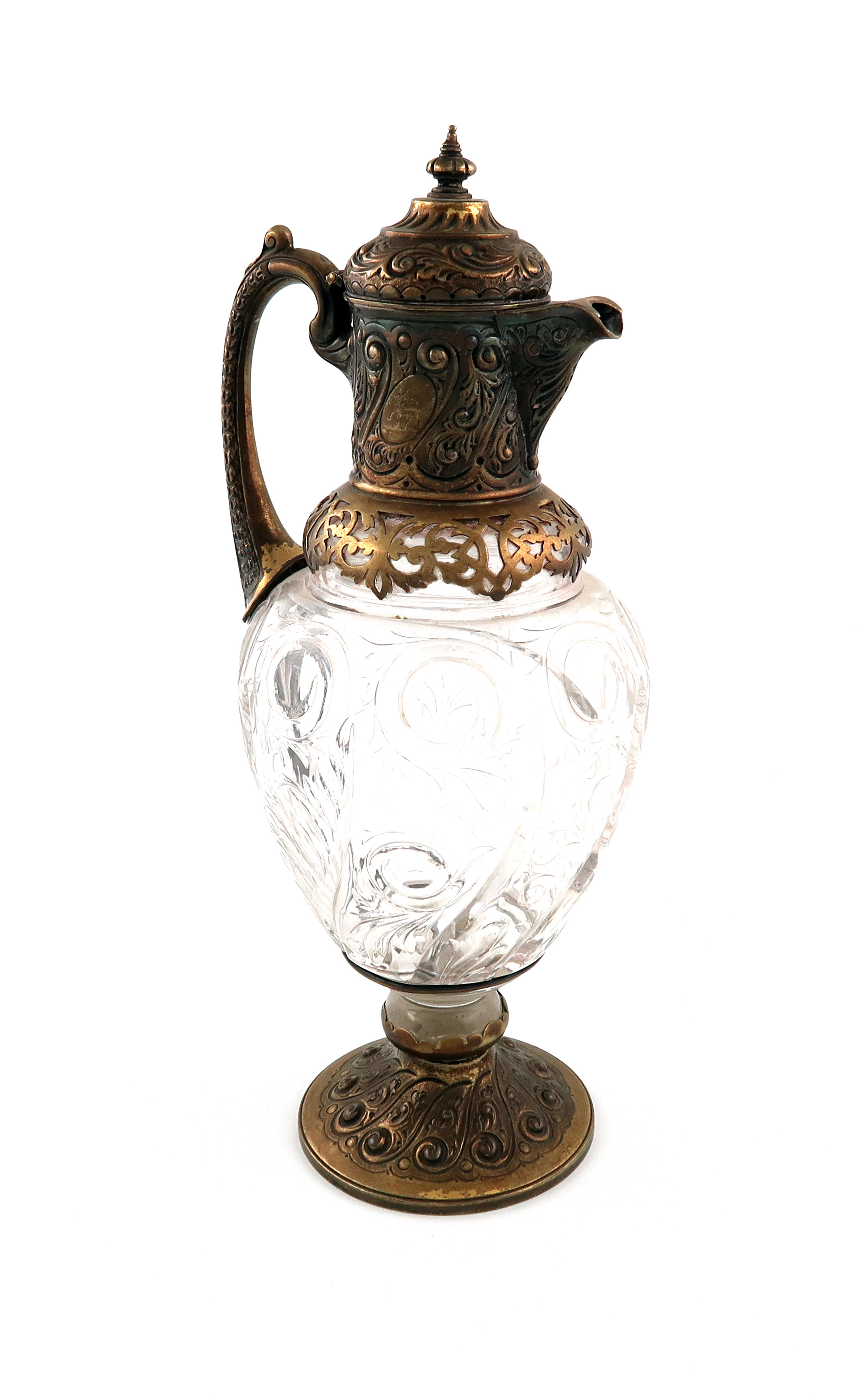 baluster form, the glass body with foliate scrolls (cracked), the silver mounts with embossed and pierced foliate decoration, scroll handle, hinged cover with a baluster finial, on a raised circular foot, height 30.3cm.