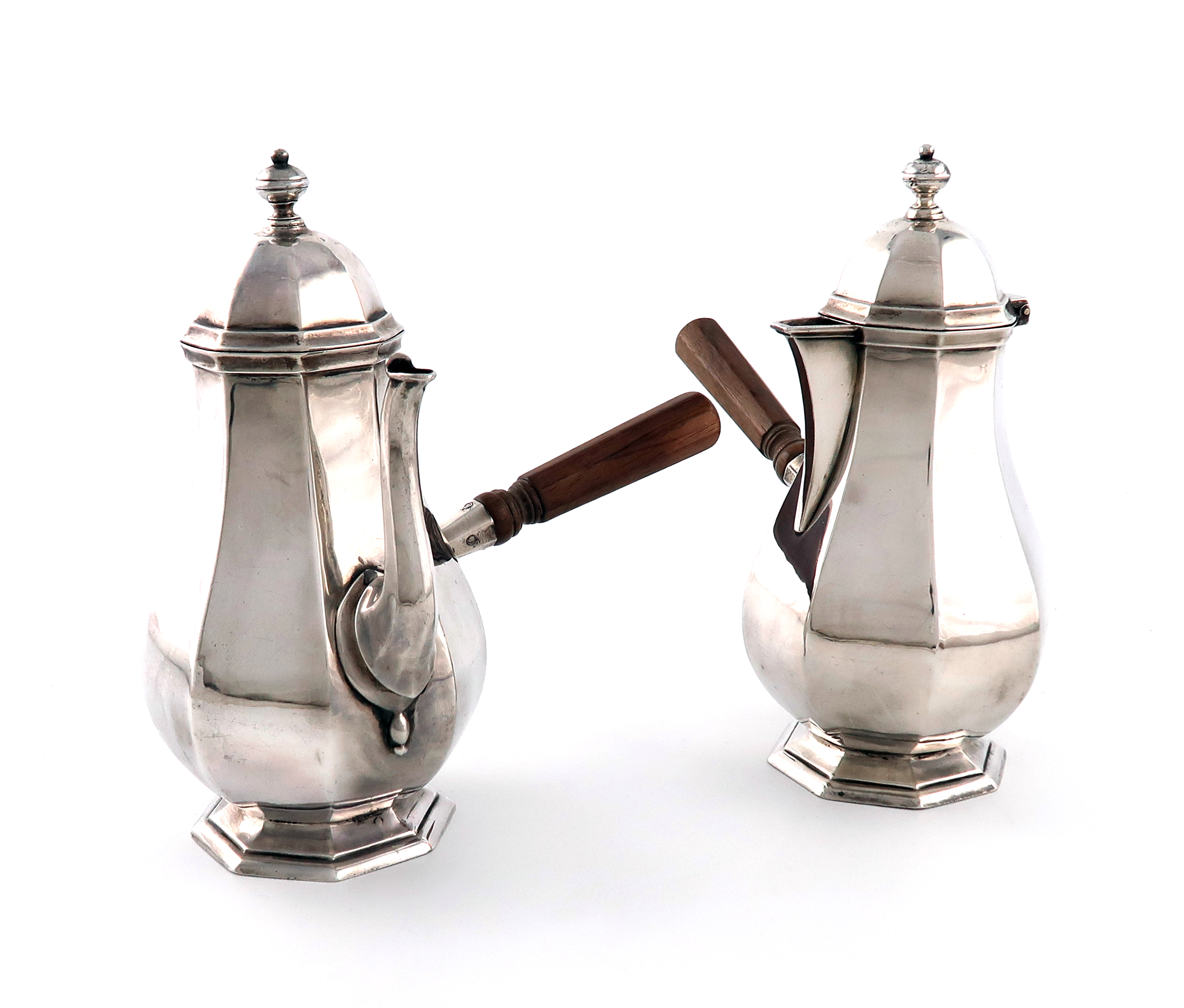 faceted baluster form, domed hinged covers with knop finials, wooden side handles, on a raised octagonal foot, height 20.3cm, approx. weight 23.9oz. (2)