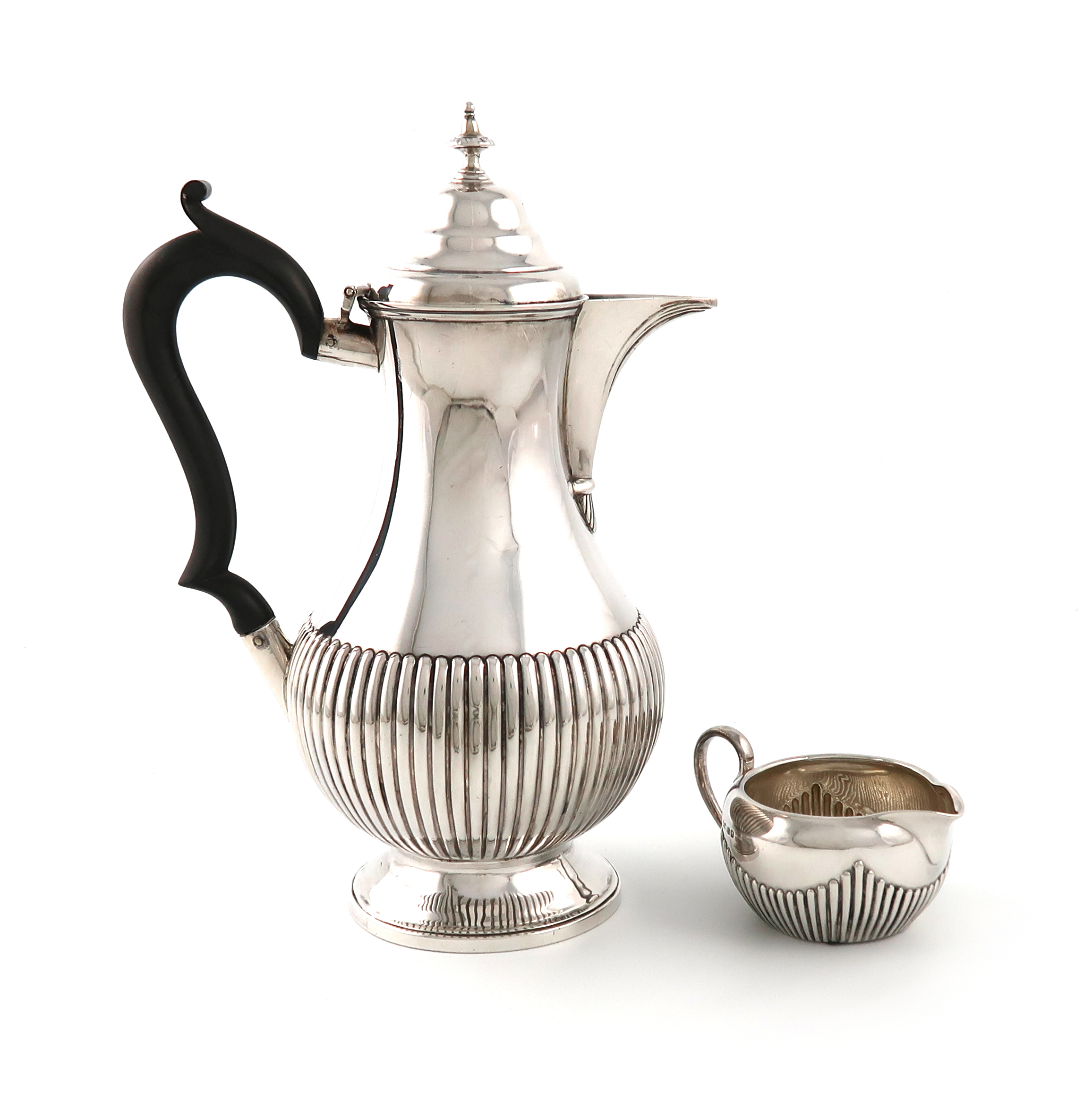 circular bellied form, part fluted decoration, a domed hinged cover with knop finial, scroll handle, on a circular foot, height 22.1cm, the cream jug of similar form, height 4.8cm, total approx. weight 14.9oz. (2)
