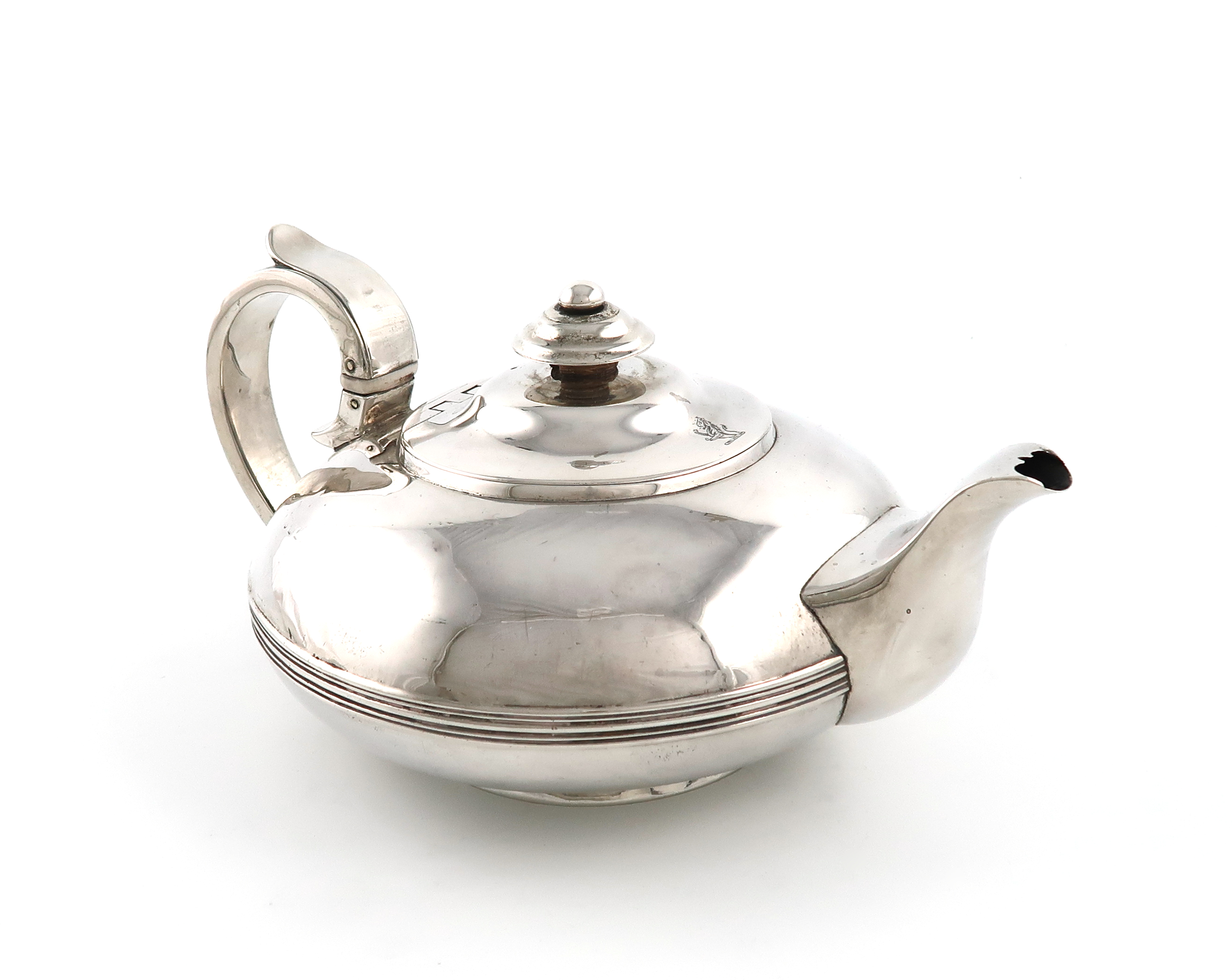 compressed circular form, scroll handle with ivory insulators, flush-hinged domed cover, engraved with a crest, central girdle, on a circular foot, length handle to spout 25cm, approx. weight 19.3oz.