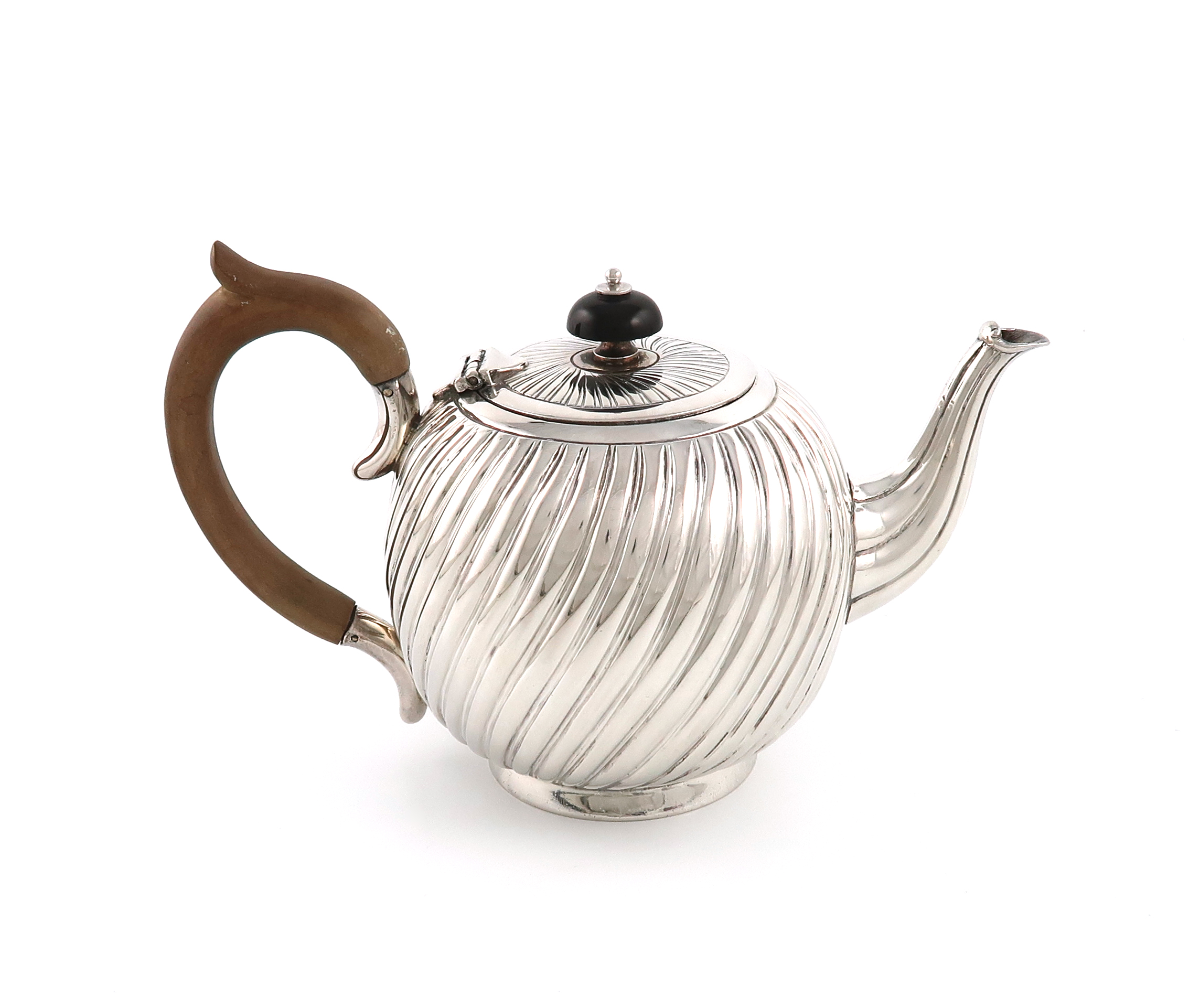 swirl fluted globular form, scroll handle, fluted spout, length handle to spout 21.8cm, approx. weight 13.5oz.
