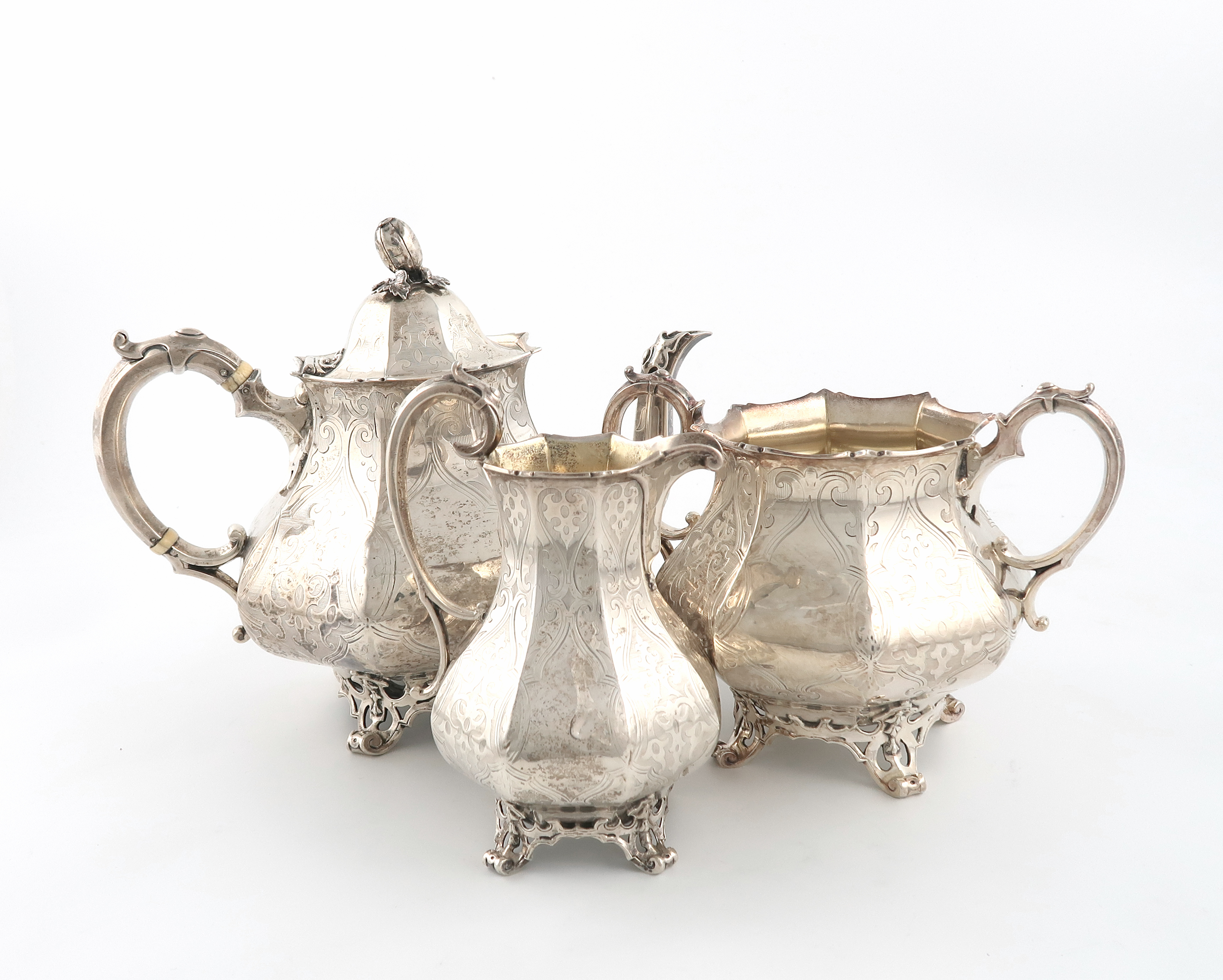 panelled baluster form, engraved decoration, scroll handle with ivory insulators, the hinged cover with a melon finial, on four pierced bracket feet, length handle to spout 25.5cm, approx. weight 41oz. (3)