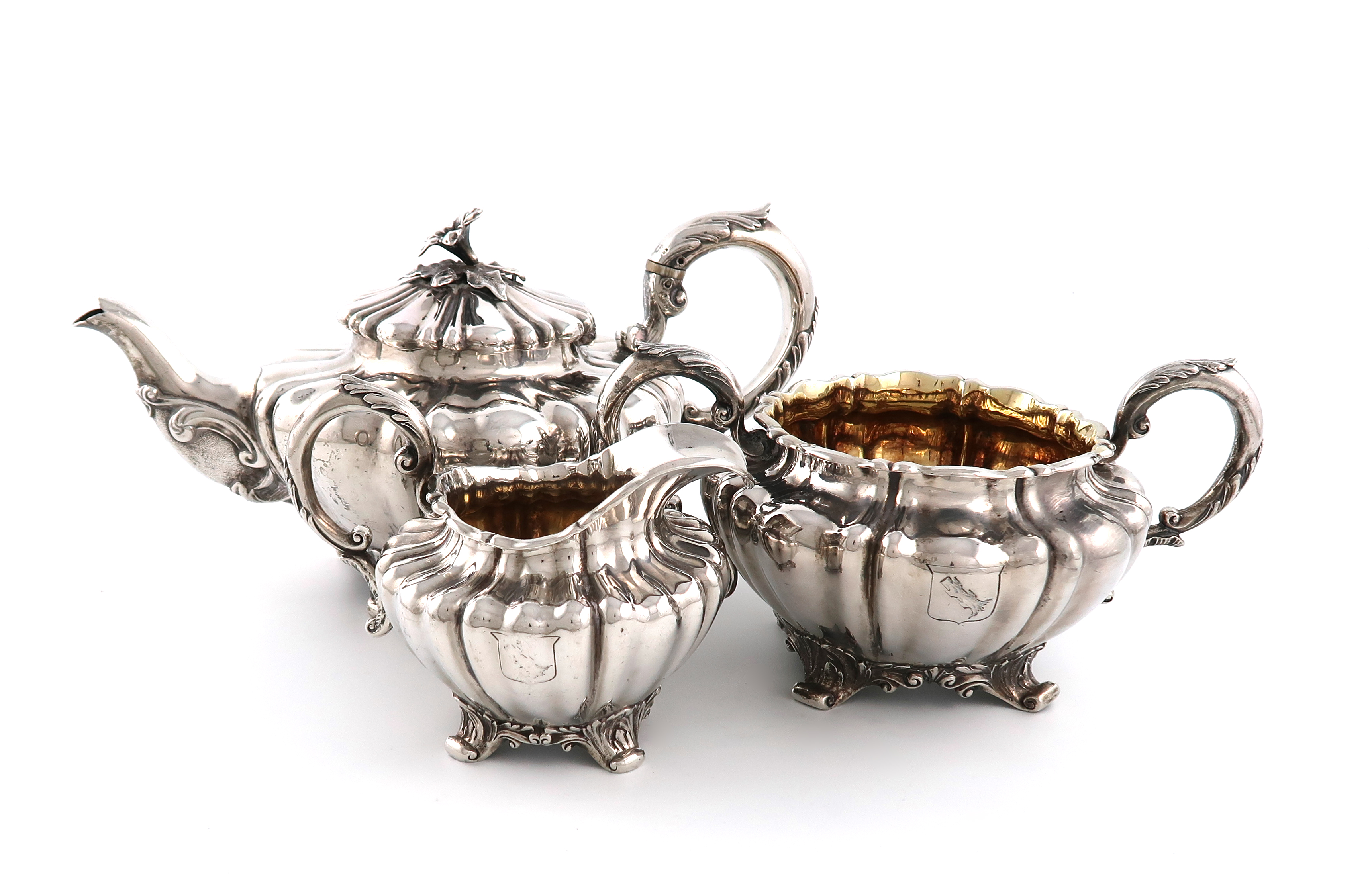 lobed tapering circular form, leaf capped scroll handles, the teapot with ivory insulators, the hinged cover with a flower finial, on four leaf capped foliate bracket feet, engraved with n armorial shield, on four scroll bracket feet, length handle to spout, length 28.5cm, approx. weight 47.7oz. (3)