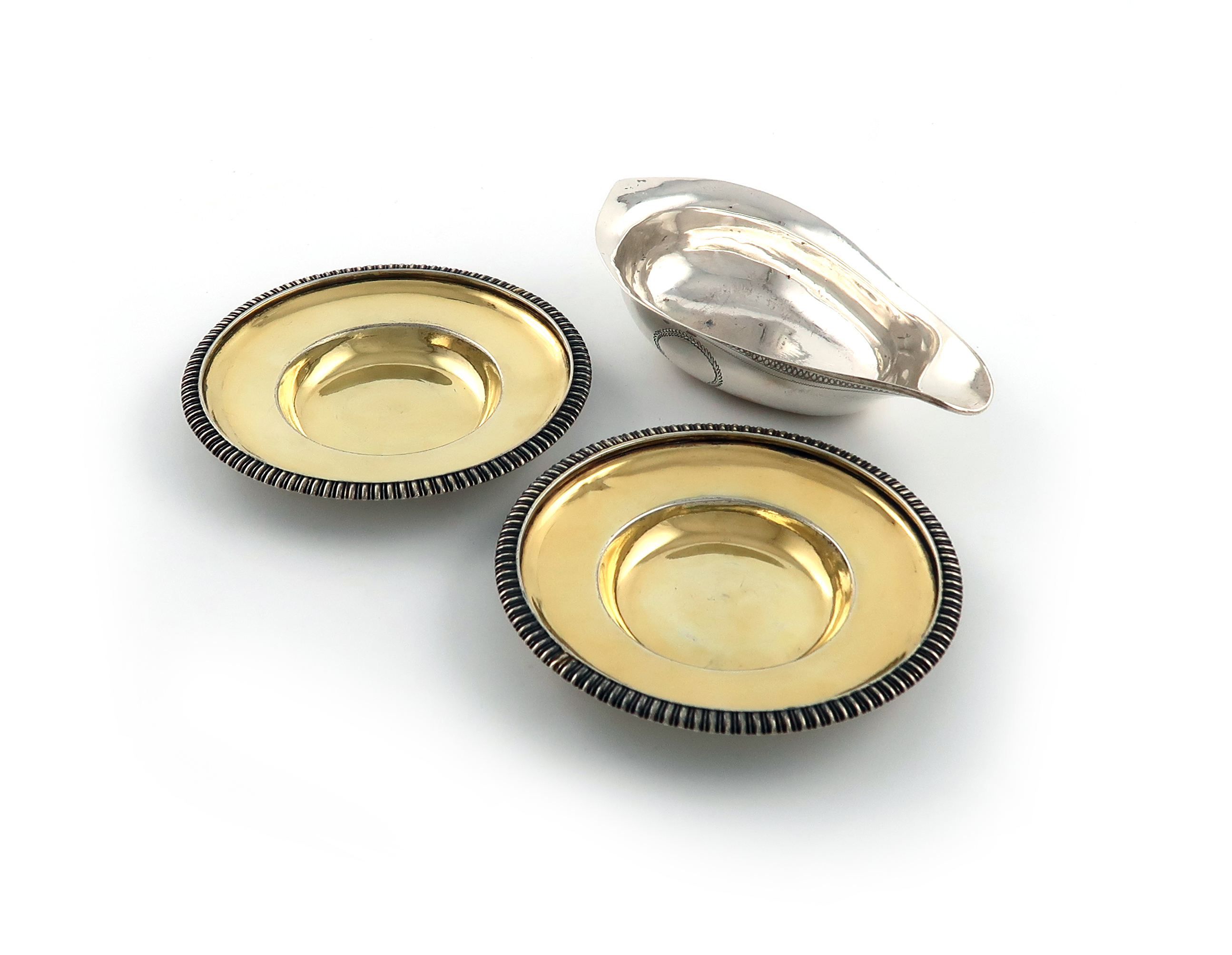 oval form, engraved border, length 13.2cm, plus a pair of George III parcel-gilt salt dishes by Nutting & Hennell, London 1808, circular form, gadroon border, approx. weight 7oz. (3)