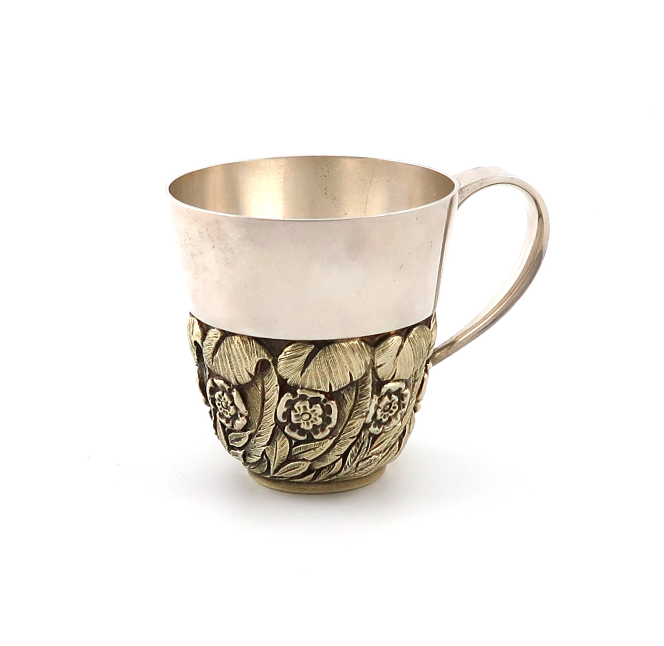 tapering circular form, part gilt Prince of Wales Feather with rose decoration, scroll handle, engraved inscription to the base ' PRINCE WILLIAM OF WALES: BORN 21.6.82', height 6.2cm, approx. weight 5.2oz.