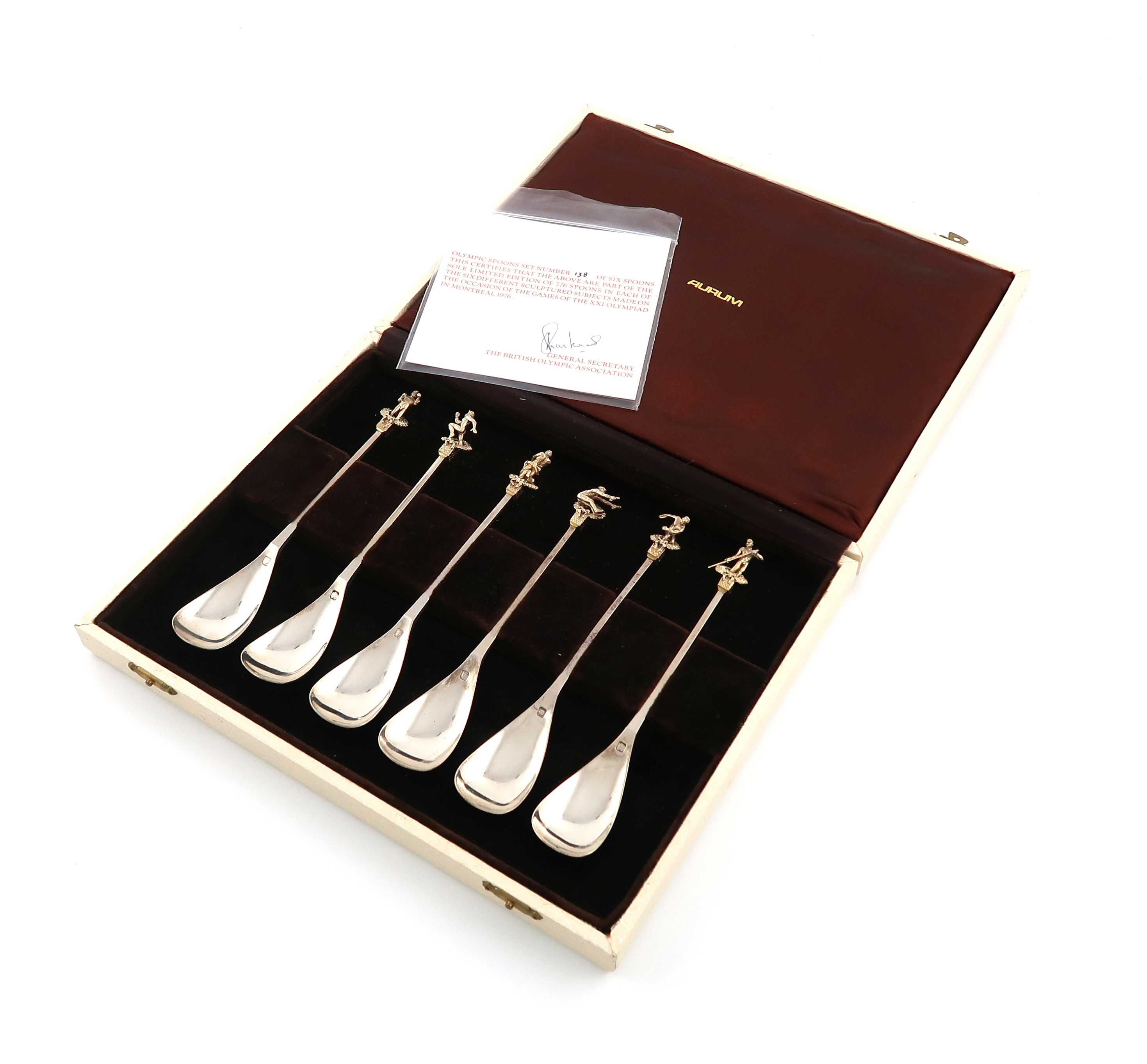 elongated bowls, with silver-gilt figural finials depicting six ancient Olympic sports, commemorating the 1976 Montreal Olympic games with a signed certificate, length 16cm, total approx. weight 5.2oz. (6)