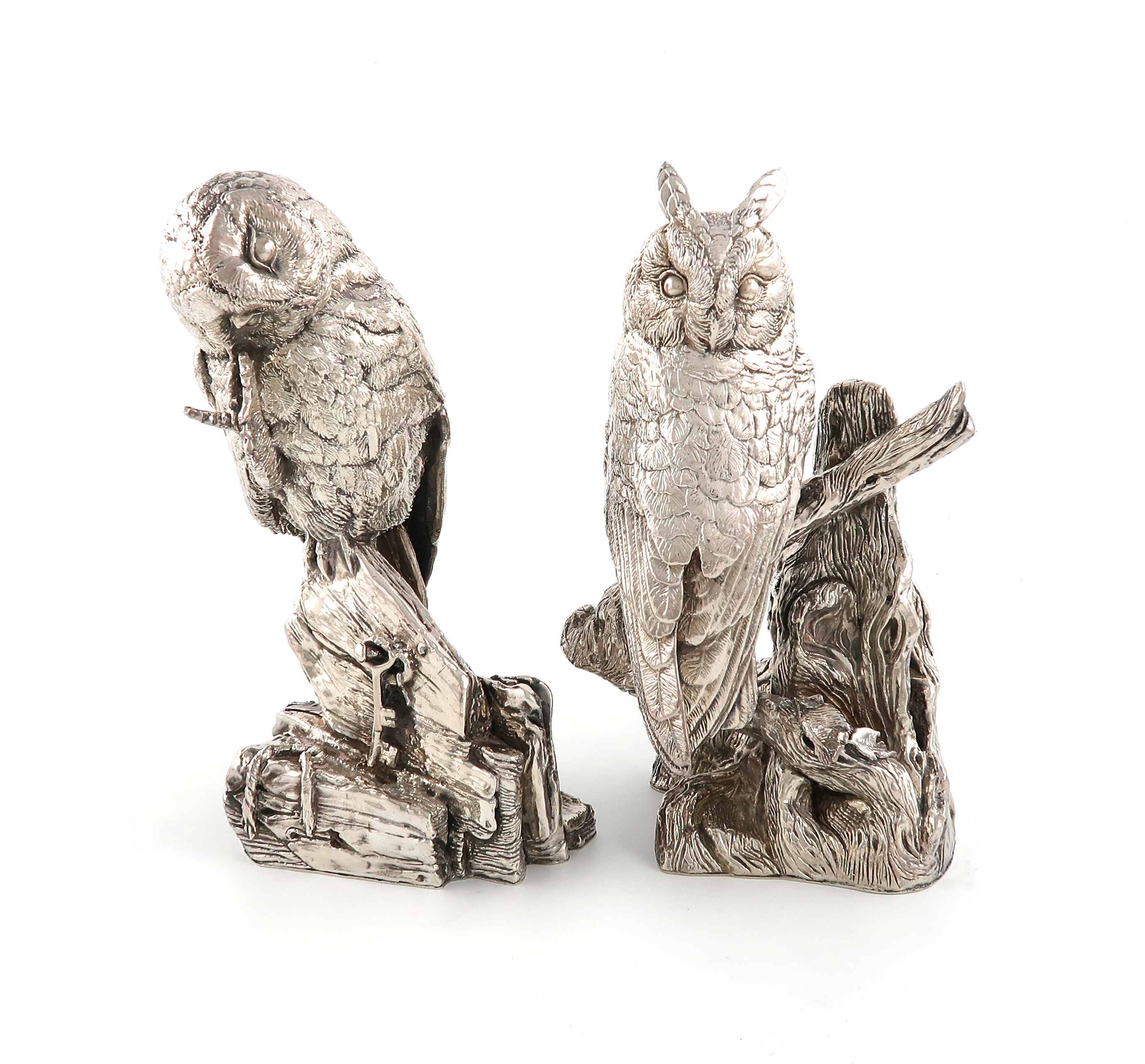 both modelled in perched positions, one on a branch, the other on an old wooden fence, textured feathers, the undersides inscribed ' Jane and David', 'A pair of Wise Old Birds', filled, heights 22cm. (2)