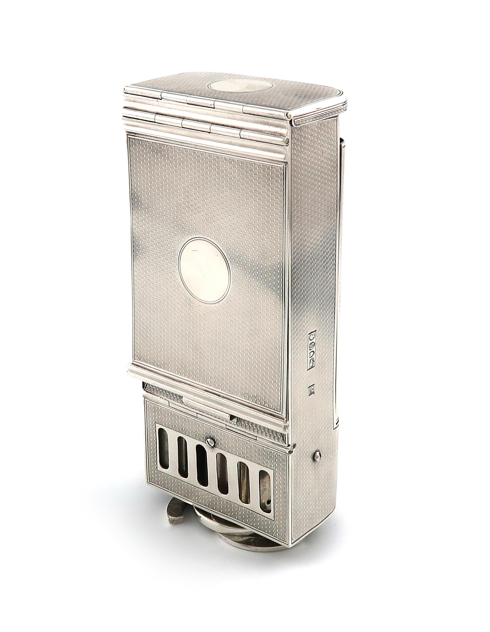 rectangular form, engine turned decoration, the hinged front cover with a vacant cartouche, the top with a hinged cover with a vacant cartouche, the hinged front opens to reveal the glass panel, the reverse with a ring attachment and spike supports, the underside with a vesta compartment and hinged striker, the base with hinged supports for table use, height closed 14.8cm.