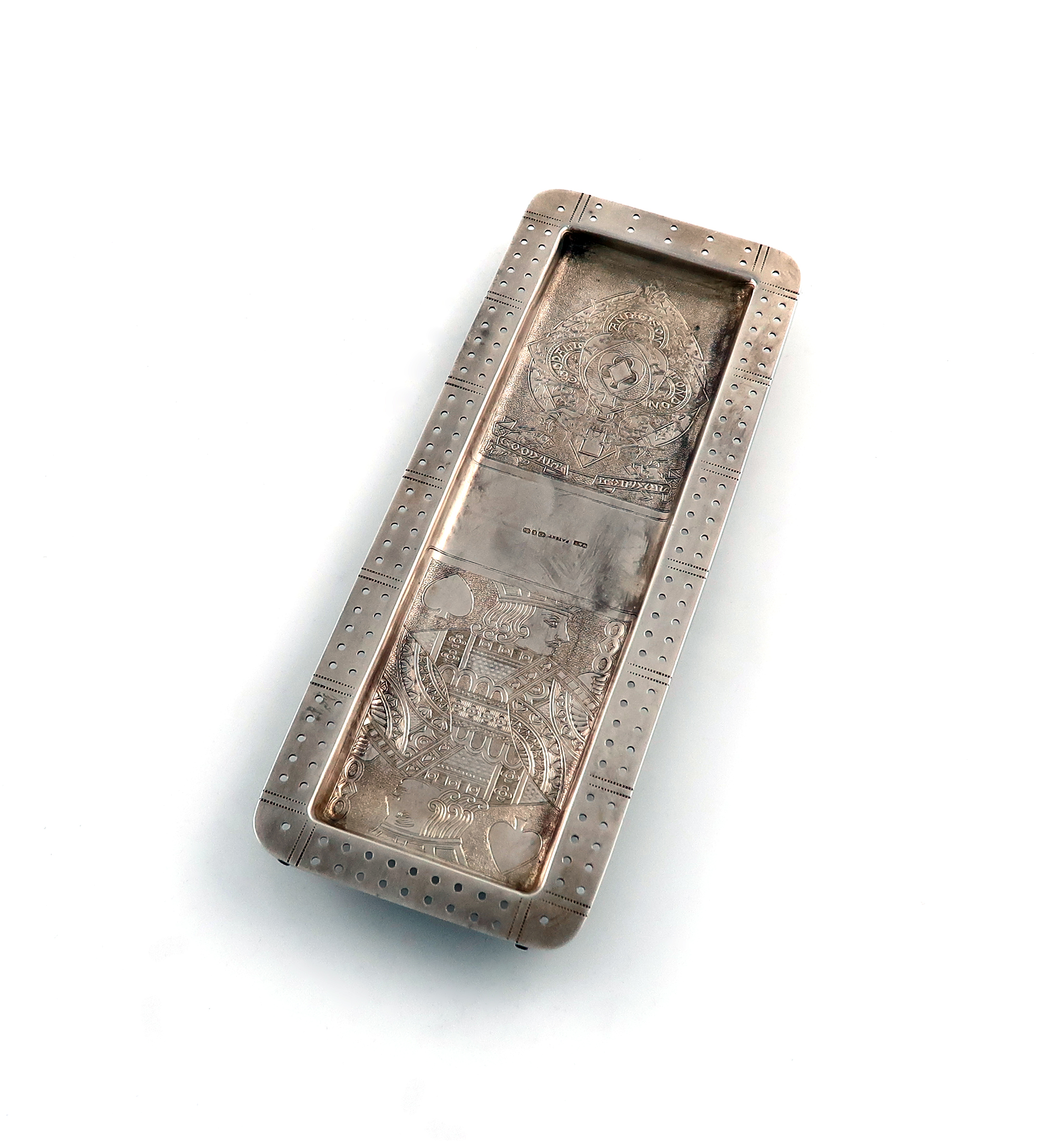 rectangular form, engraved with the Jack of Spades and the reverse of a playing card with 'Goodall and Son, London', on a matted background, the underside with four tubes for pegs and on four ball feet, length 22.9cm, approx. weight 5.9oz.