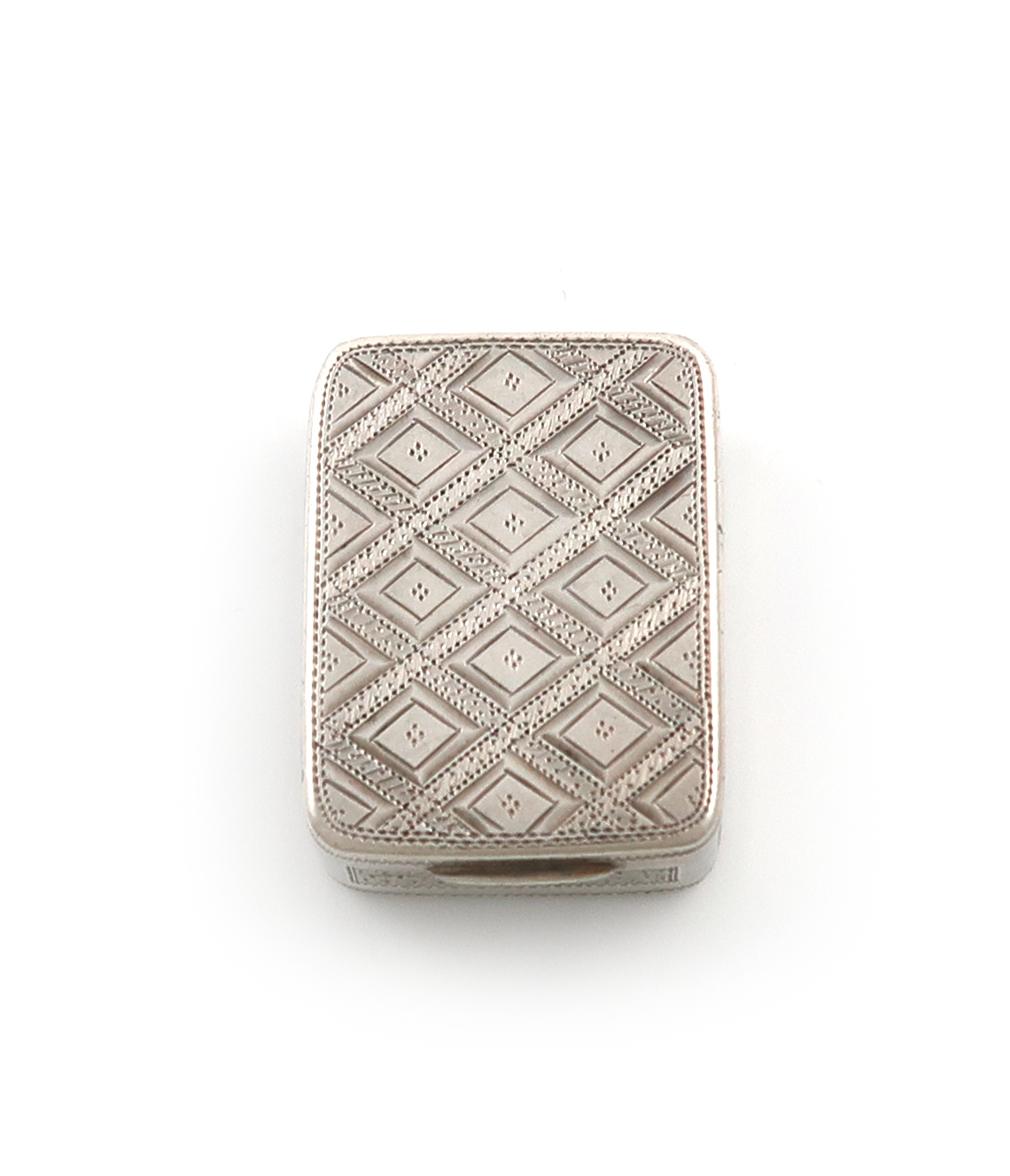 rectangular form, the hinged cover and base with engraved lozenge decoration, central cartouche, the hinged cover opens to reveal a pierced and embossed silver-gilt grille with scene of HMS Victory facing left, and embossed 'Victory' and 'Trafalgar', 'Octr 21, 1805', length 2.9cm, approx. weight 0.5oz.