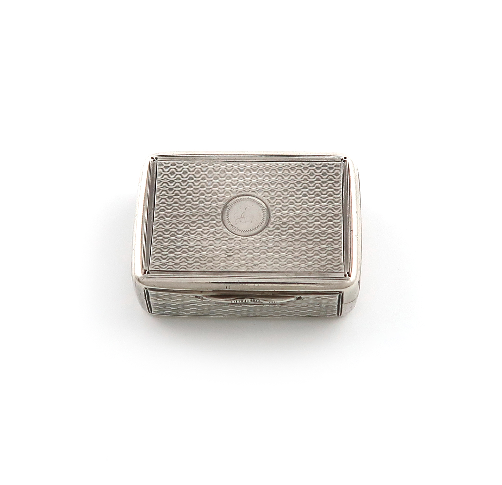 rectangular form, the hinged cover and base with engine-turned decoration, plain thumb-piece, the hinged cover opens to reveal a pierced and engraved silver-gilt grille, with a flag, cannon and drums and foliate decoration, length 3.6cm, approx. weight 0.7oz.