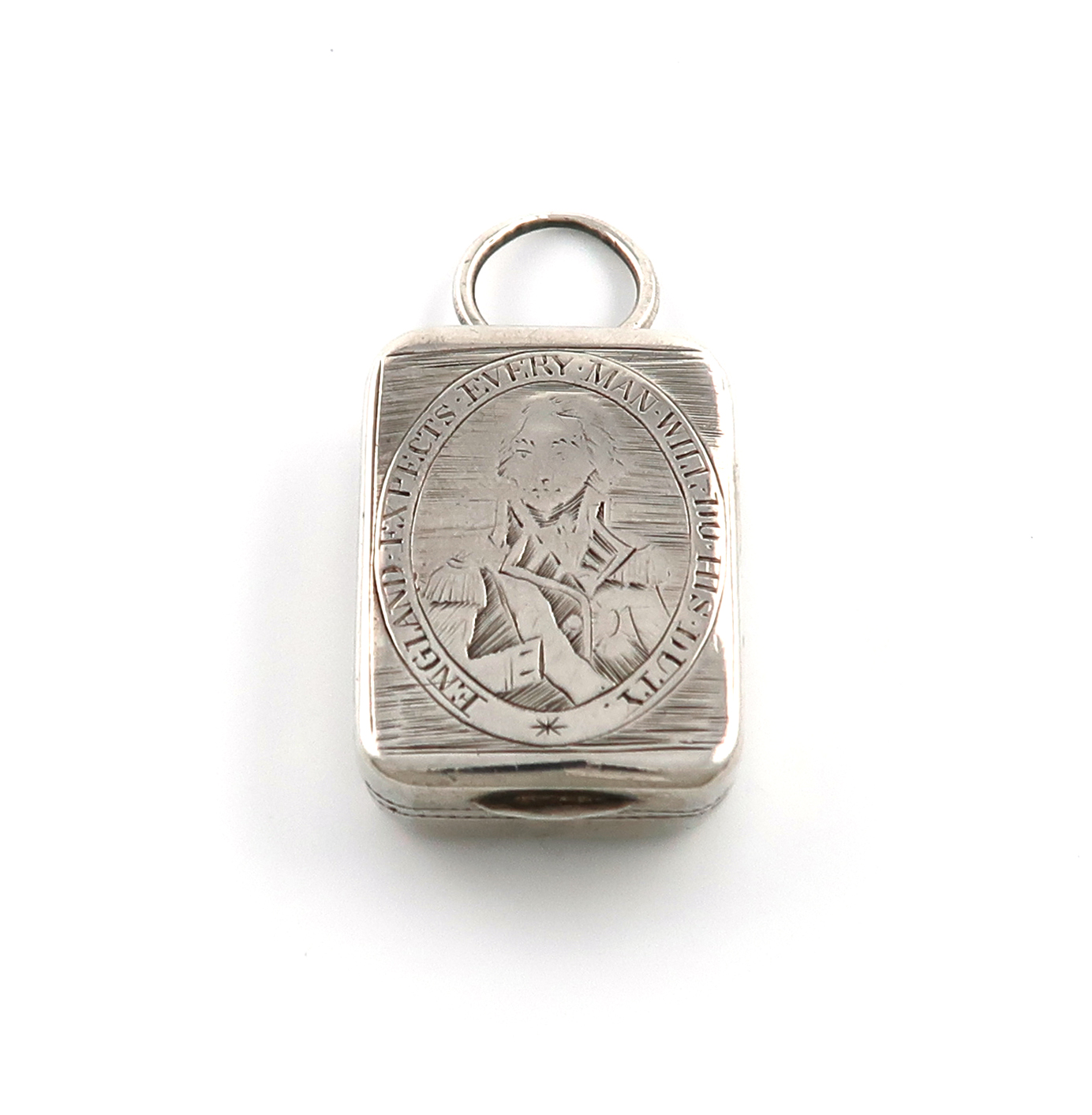 rectangular form, the hinged cover with an engraved portrait of Nelson within an oval border, inscribed 'England Expects Every Man Will Do His Duty', with reeded decoration, plain thumb-piece, the underside with a foliate motif, the hinged cover opens to reveal a pierced and embossed silver-gilt grille with scene of HMS Victory facing right and stamped 'Victory' and embossed 'Trafalgar Ocr. 21. 1805', with a later soldered ring attachment, total length 4.3cm, approx. weight 0.5oz.