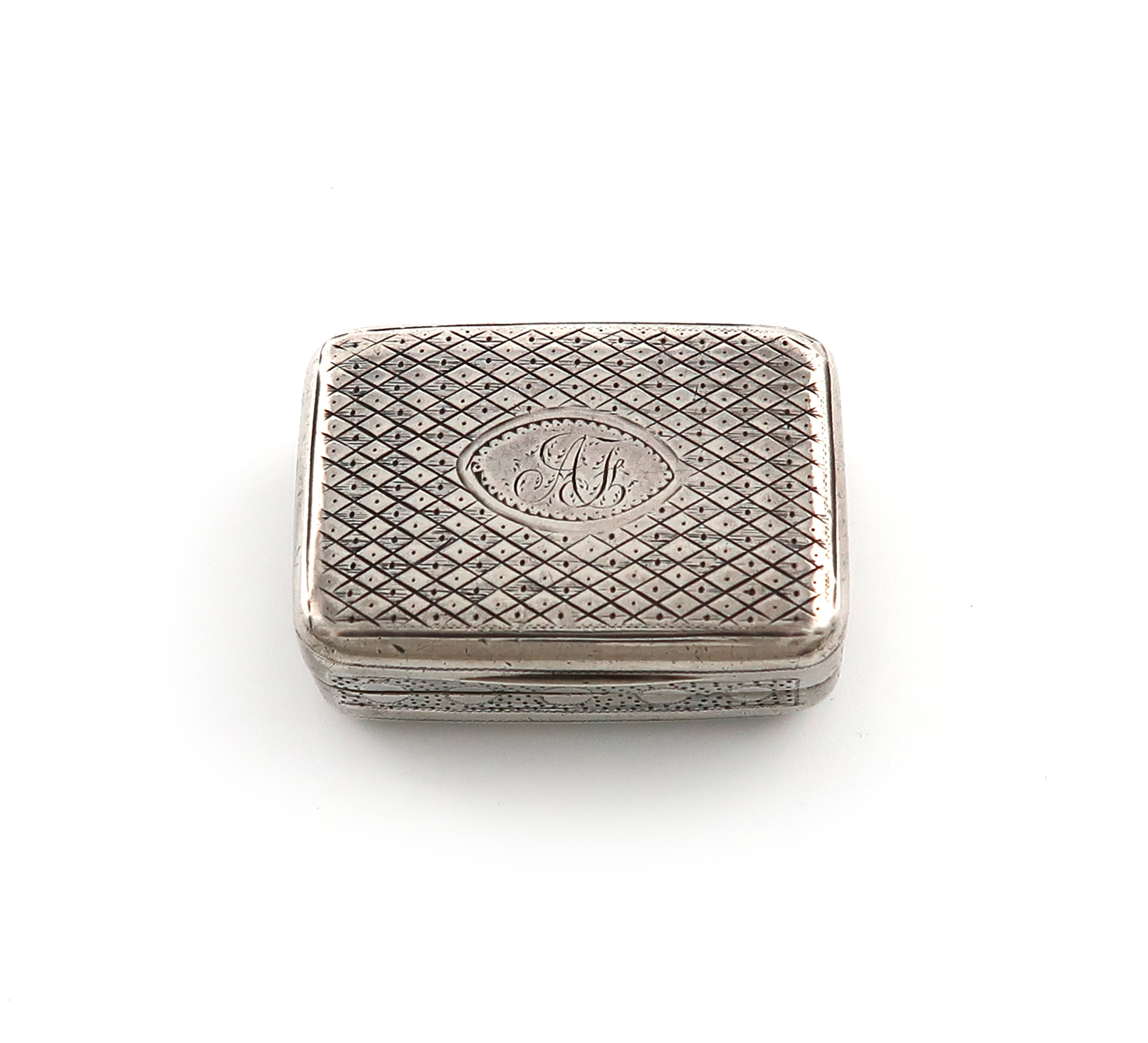 rectangular form, the hinged cover and base with engraved trellis decoration, engraved sides, the hinged cover with initials, plain thumb-piece, the hinged cover opens to reveal a pierced and embossed silver-gilt grille with an anchor and foliate decoration, length 3.5m, approx. weight 0.6oz.