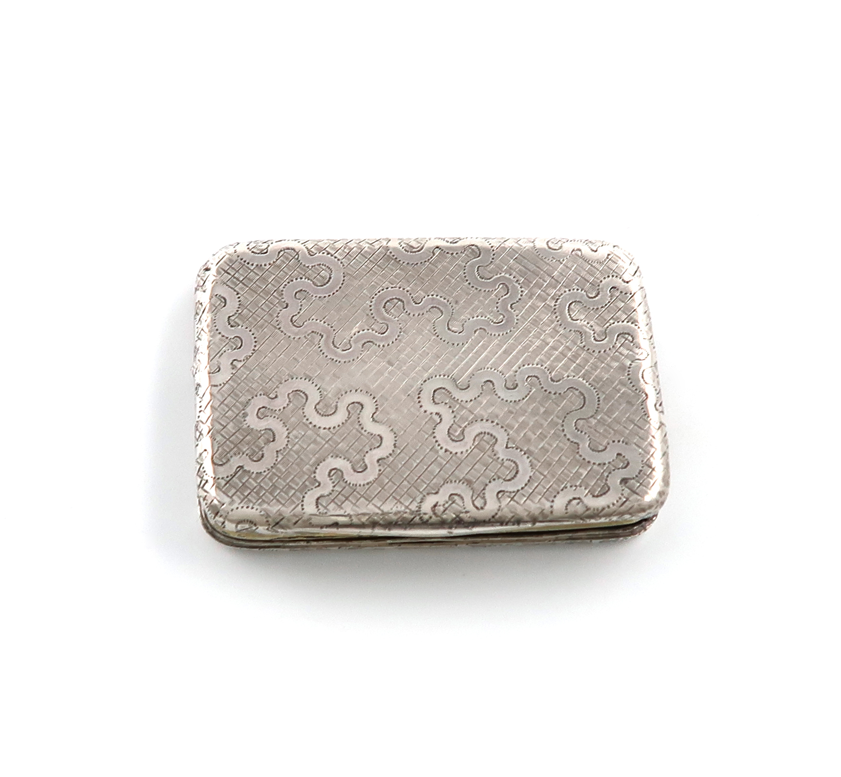 flat rectangular form, the hinged cover and base with wriggle-work decoration, plain thumb-piece, the hinged cover opens to reveal a pierced and engraved silver-gilt grille, with flags, cannons and drums and foliate decoration, length 5cm, approx. weight 0.8oz.