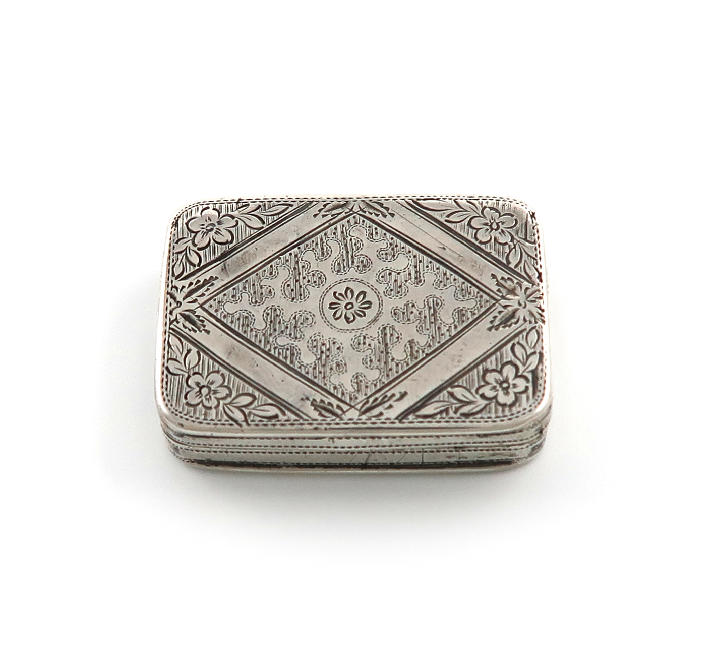 rectangular form, the hinged cover and base with engraved foliate and wriggle-work decoration with a lozenge motif, the hinged cover opens to reveal a pierced and embossed silver-gilt grille with scene of HMS Victory facing right within foliate decoration, and embossed 'Victory' and engraved 'Immortal Nelson', length 3.2cm, approx. weight 0.5oz.